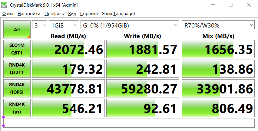 Проверку скорости передачи данных я выполнил с использованием внешнего USB-кейса TerraMaster D1 Plus и установленного в него NVMe-накопителя. Тест проводился в CrystalDiskMark. В последовательном режиме получено чтение 2072 МБ/с и запись 1881 МБ/с. В пересчете это примерно 16.6 Гбит/с на чтение и около 15 Гбит/с на запись.