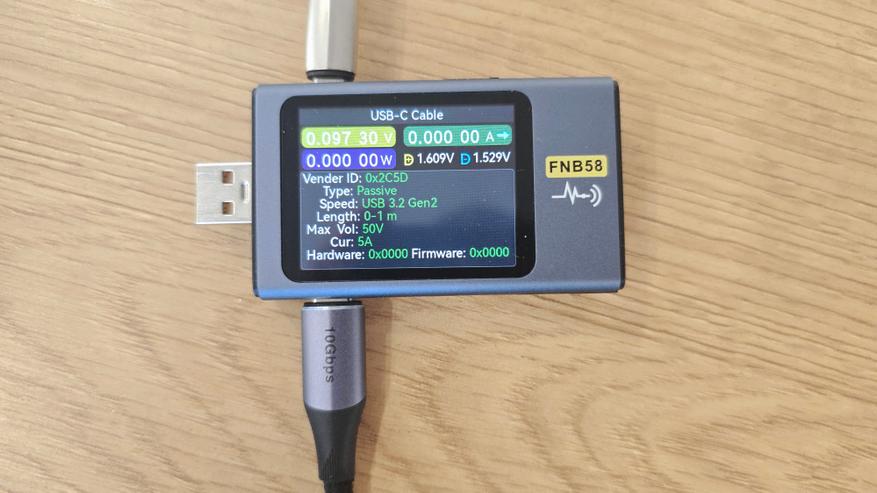 Далее я проверил данные, которые кабель передает через E-Marker, заодно подтвердив сам факт его наличия. Кабель определяется как пассивный, что ожидаемо для Type-C to Type-C без активных компонентов. Скорость заявлена как USB 3.2 Gen 2, длина определяется в диапазоне 0-1 м, что совпадает с фактическим размером. Максимальное напряжение, передаваемое через E-Marker, составляет 50 В, максимальный ток — 5 А. Ошибок чтения тестер не показывает, данные отображаются одинаково при повторных подключениях. Именно через этот механизм источник питания и устройство получают корректную информацию о допустимых режимах работы.