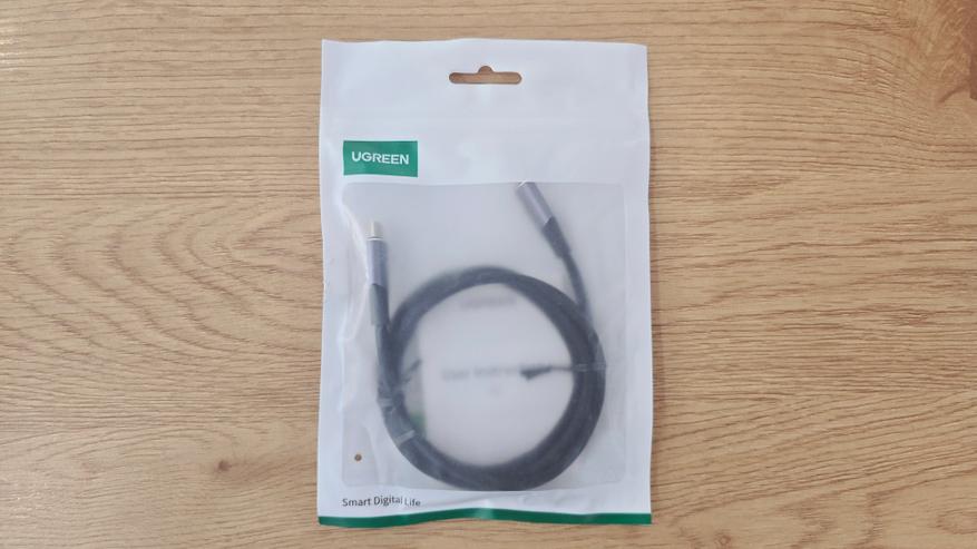 Кабель поставляется в характерной для UGREEN упаковке — пакете с прозрачным окошком и надежным зип-замком. Дизайн выполнен в сдержанных бело-зеленых тонах. На обратной стороне упаковки размещена информационная наклейка с указанием модели (US355), поддержки стандарта USB 3.2 Gen 2, метровой длины, а также цвета изделия, с добавлением обязательных сертификационных знаков и сведений о компании-производителе.