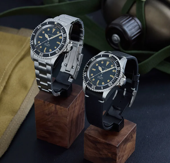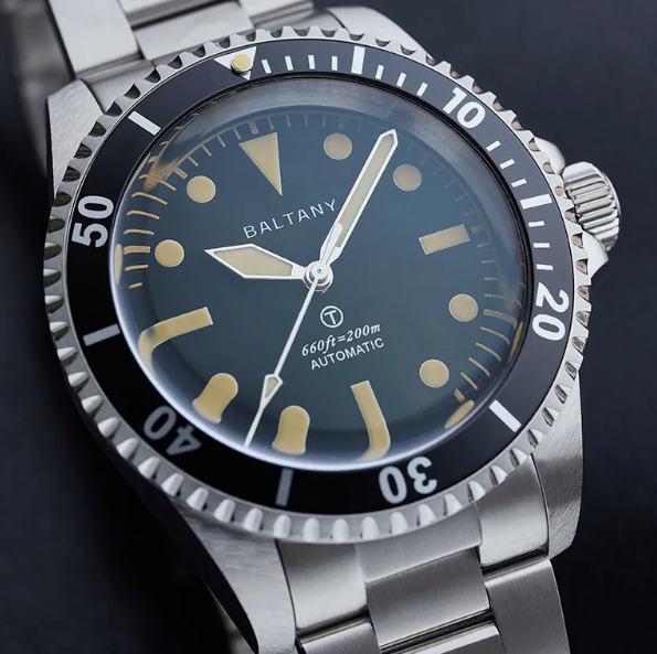 Циферблат тёмный, с простой разметкой и лёгким винтажным характером. Стрелки и метки со светонакопительным покрытием остаются заметными в темноте. Сапфировое стекло с антибликом защищает поверхность. По краю расположен алюминиевый безель с односторонним вращением.