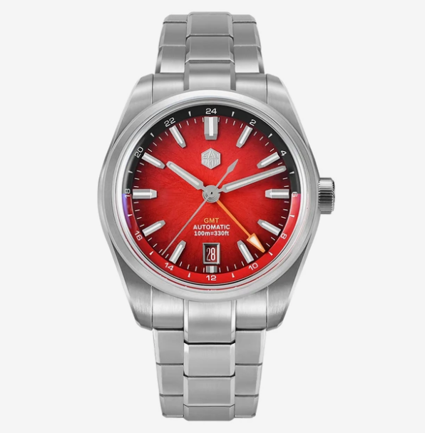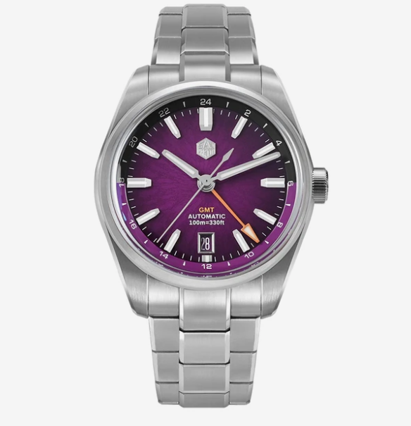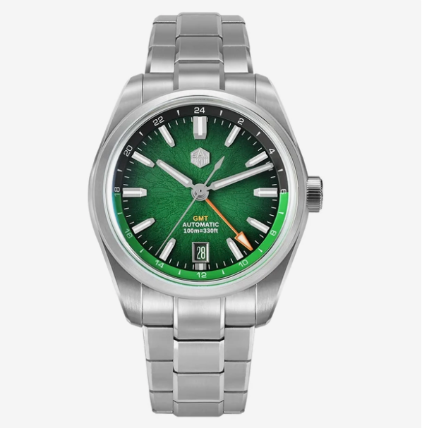 Внутри установлен автоматический калибр Miyota 9075 с частотой 28 800 полуколебаний и запасом хода до 42 часов. Предусмотрены ручной завод, остановка секундной стрелки и отдельная GMT-индикация для второго часового пояса, удобно при перелётах и работе с разным временем.
