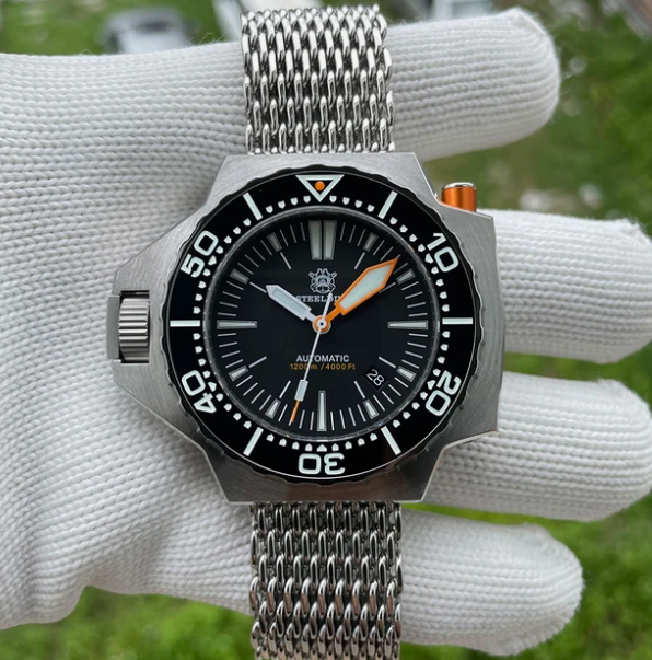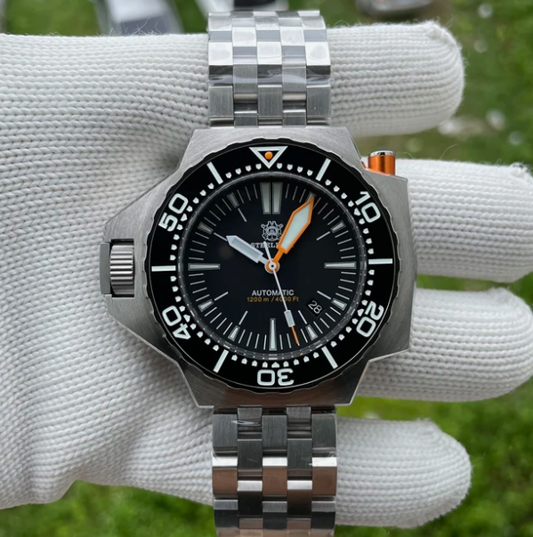 Эта модель выполнена в формате с увеличенными пропорциями и усиленной конструкцией. Корпус из нержавеющей стали 316L имеет диаметр 49,6 мм и толщину около 15 мм, расстояние от ушка до ушка — 55,7 мм. Размеры и масса создают цельное ощущение монолитной детали. Задняя крышка и заводная головка фиксируются на резьбе, корпус собран без открытых участков, что снижает проникновение влаги внутрь.