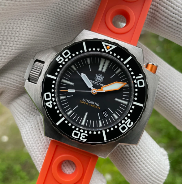 Это механика с довольно прямым, «рабочим» характером. Без попытки выглядеть нарядно или дорого. Скорее как инструмент, который просто делает своё дело. Корпус стальной, крупный — 45 мм в диаметре и около 13 мм по толщине. Металла здесь много, поэтому часы ощущаются основательно. Линии простые, без декора. Завинчивающаяся головка и задняя крышка плотно закрывают корпус, за счёт этого конструкция получается цельной и спокойно переносит воду — плавать в них можно без лишних мыслей.
