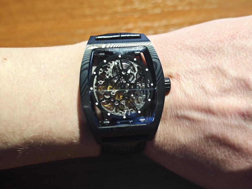 Оригинальным нужно признать и выбор материала. Тем более, что обычно дамасская сталь ассоциируется с чем-то прочным, суровым, брутальным. Здесь же скорее о часах скажешь «элегантные». Сама по себе модель довольно легкая, прозрачная… воздушная.