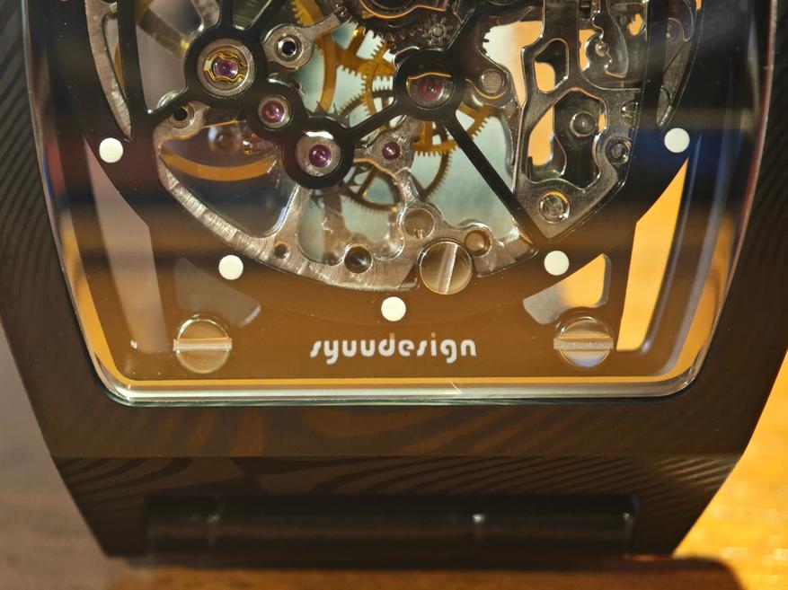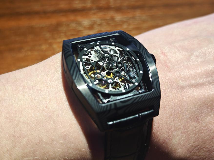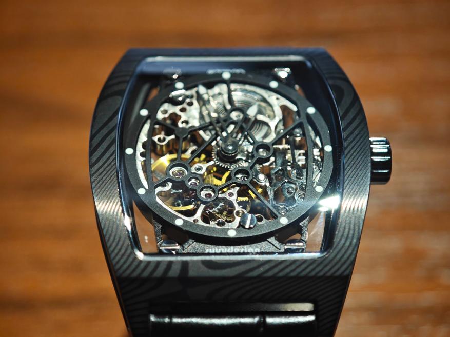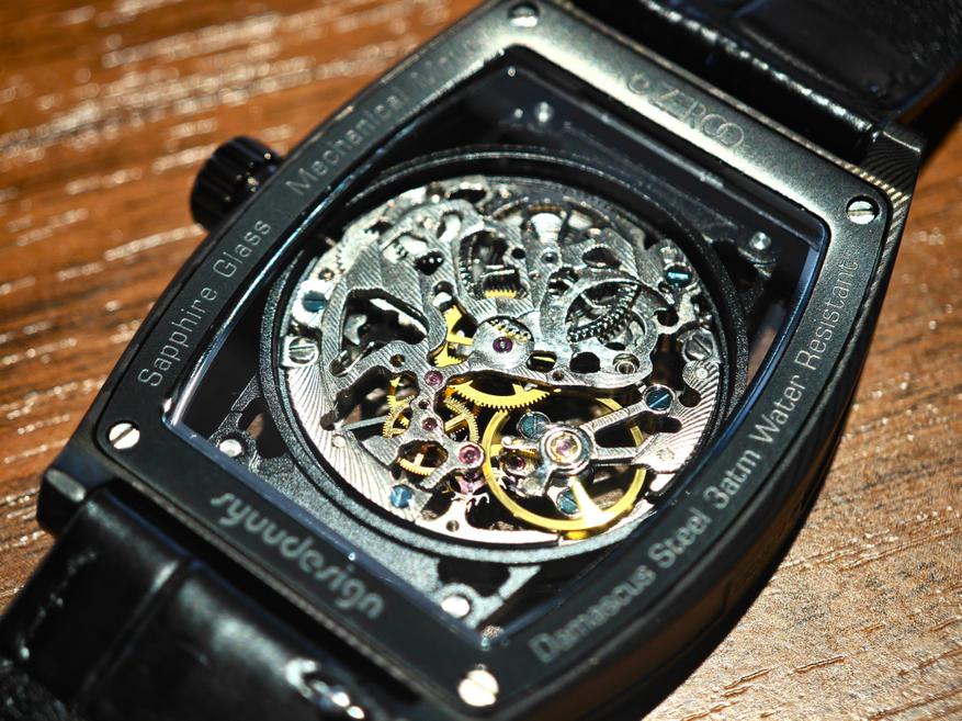 Во-первых, это корпус в форме бочке. Здесь же интерес к механическим часам с ручным заводом. Скелетонизация — 100% в тренде. Но в первую очередь — дамасская сталь.