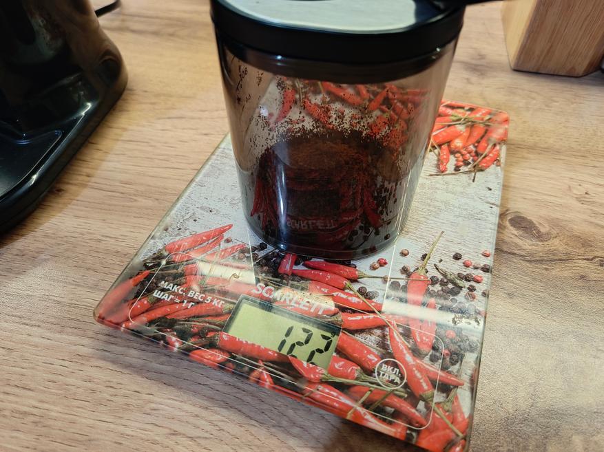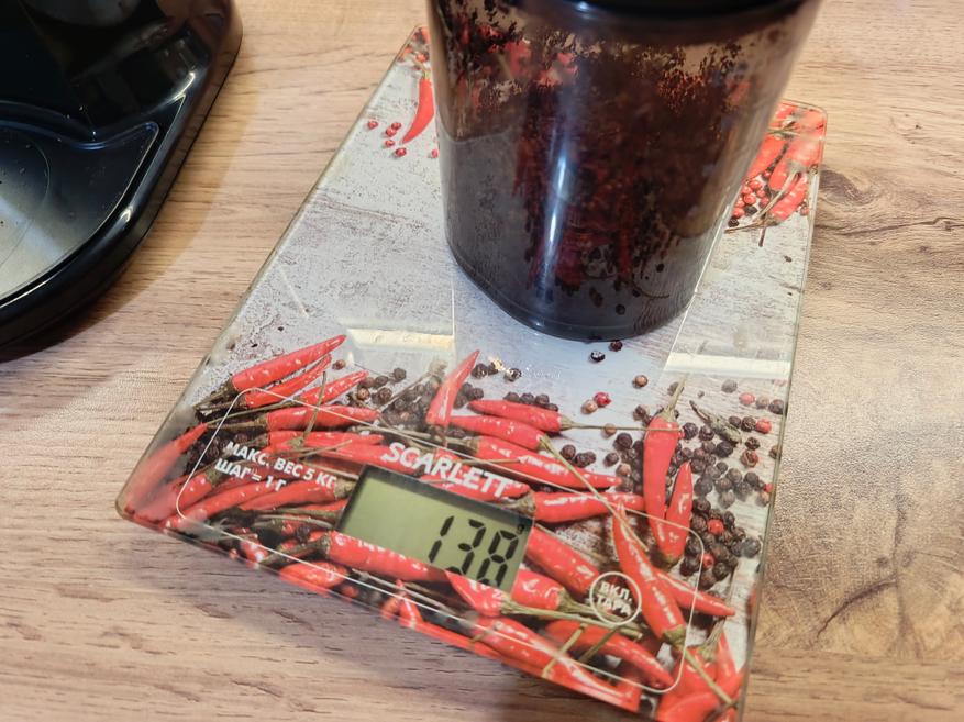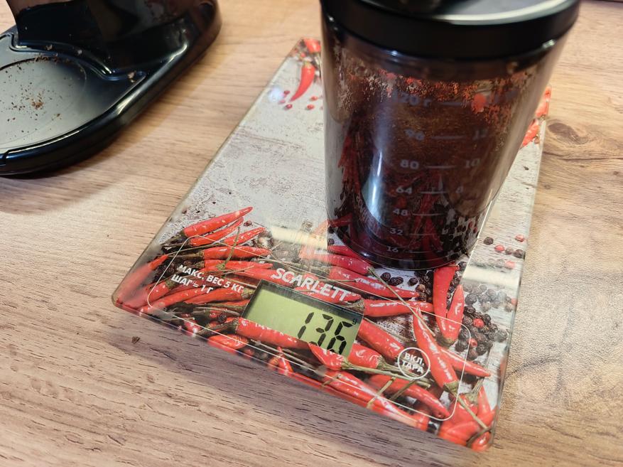 Ну, а теперь проведу пару наглядных тестов. Для каждого помола я выставил время в 10 секунд, чтобы расчёты были проще и нагляднее. Пустой контейнер для кофе весит 113 грамм, результаты взвешивания вынес в таблицу ниже.