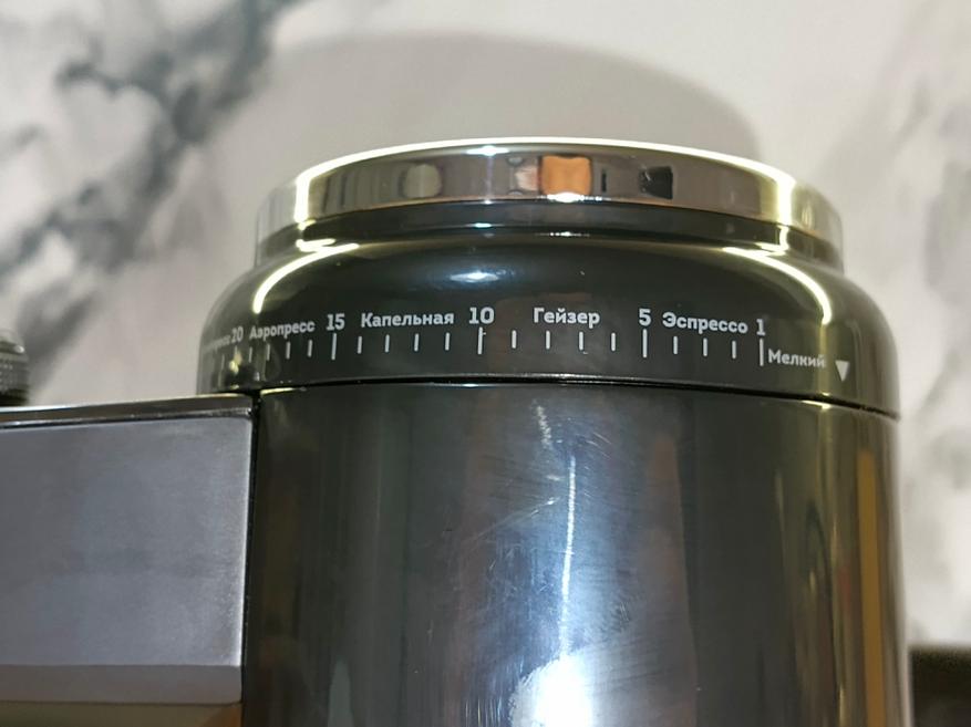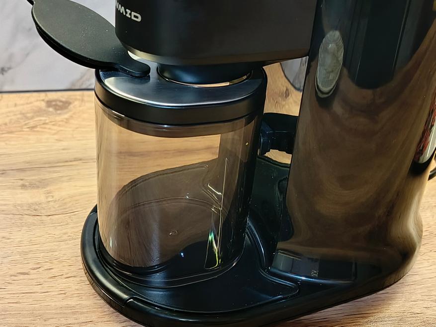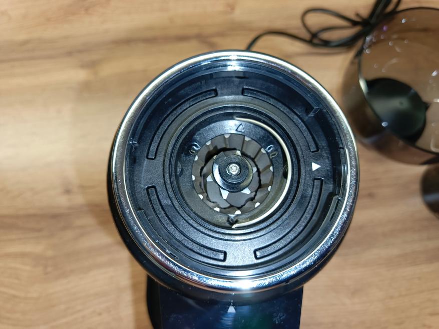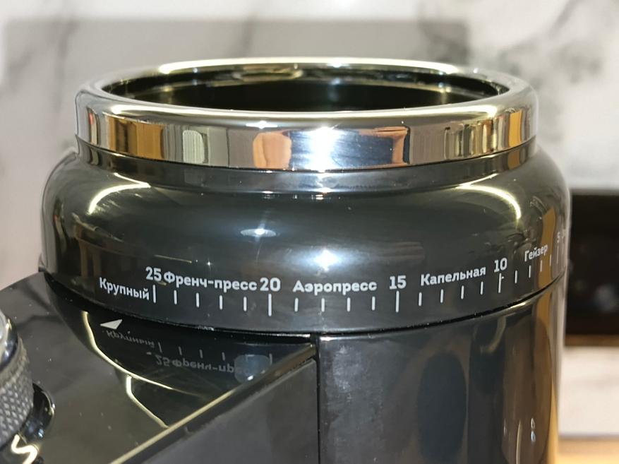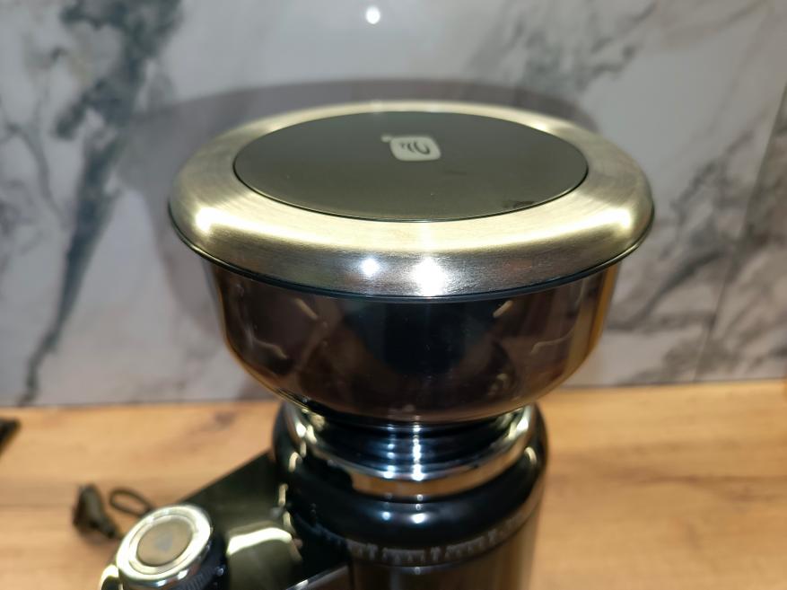За помол отвечает пара жерновов из прочного сплава SUS420. Бункер устанавливается простым лёгким поворотом до характерного щелчка. Он рассчитан на 300 грамм зернового кофе и оснащён герметичной крышкой, которая обеспечивает сохранность свежести зерен.