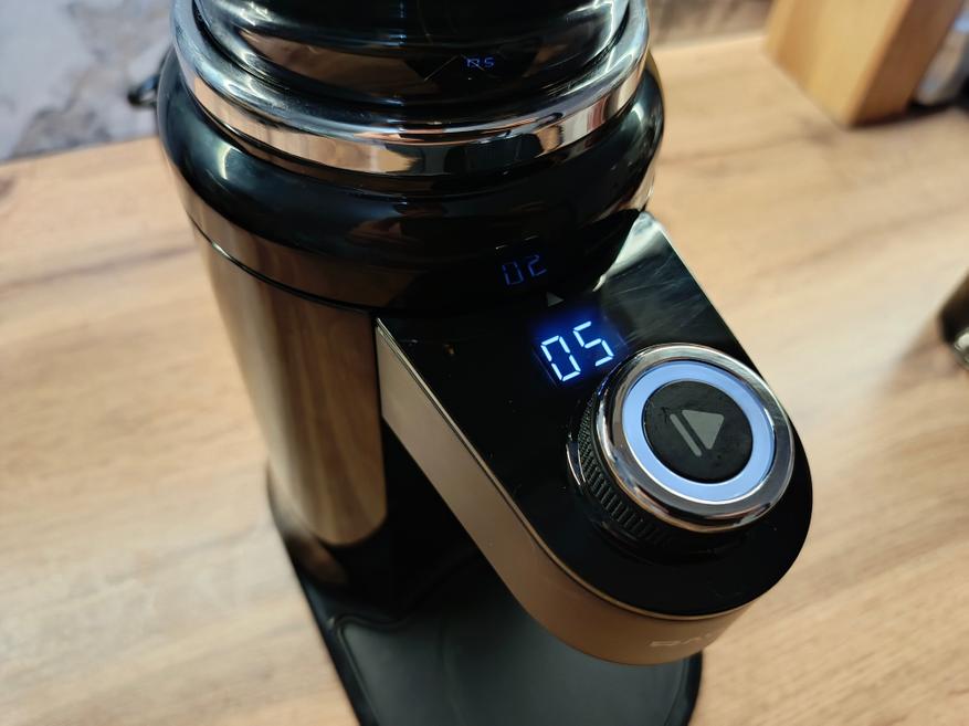 Управление здесь предельно простое — никаких лишних действий и сложных манипуляций. С помощью энкодера устанавливается время от 5 до 80 секунд с шагом в одну секунду. Цифры крупные и яркие, отлично читаются. Это таймер обратного отсчёта, именно он определяет, сколько времени кофемолка будет молоть кофе, обеспечивая точный и равномерный помол.