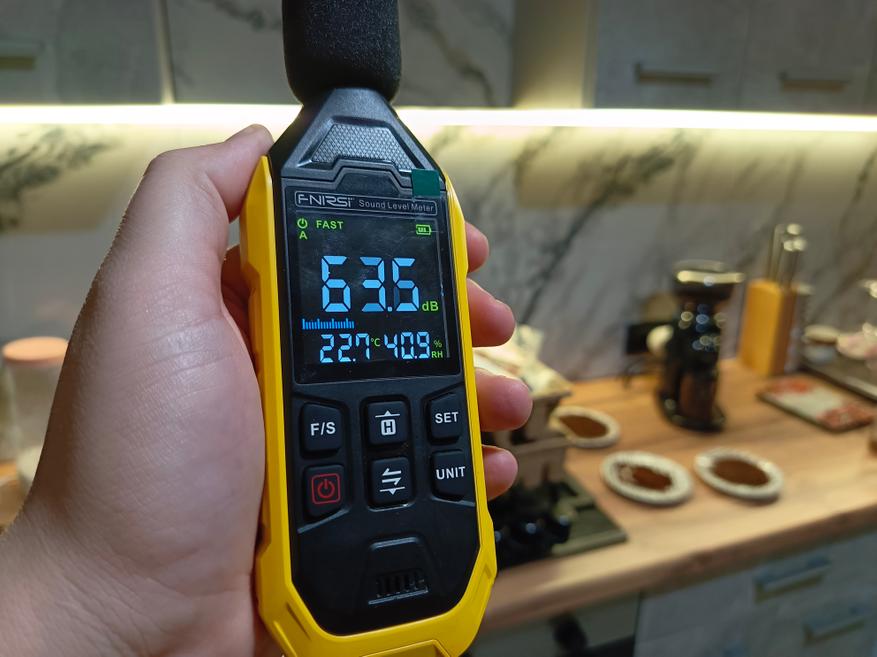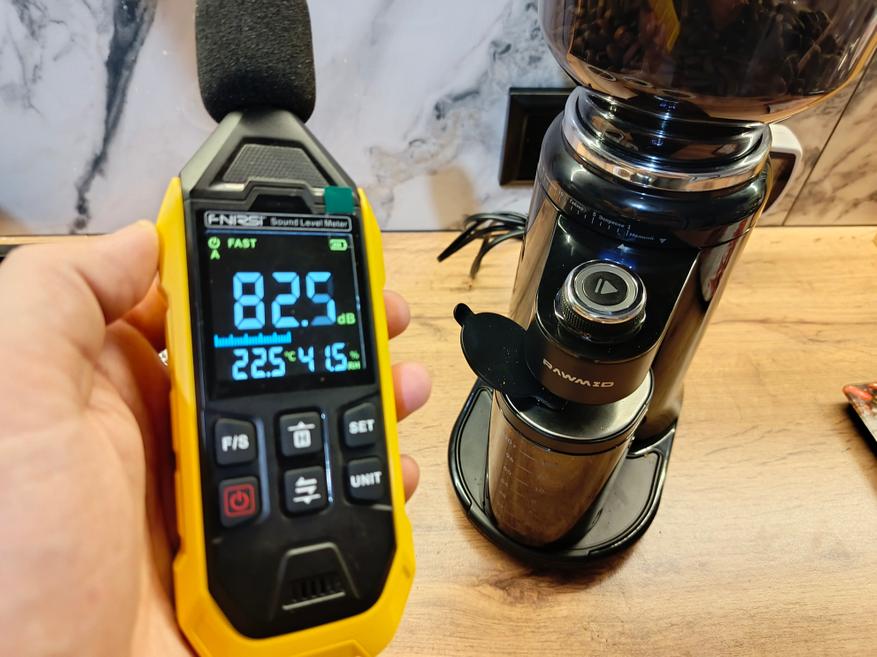 По уровню шума кофемолка работает относительно громко, но это заметно только вблизи. Замер на расстоянии около 50 см показал уровень шума в 82 дБ, а если отойти на два метра, он снижается до 63 дБ. Проще говоря, если вы будете готовить кофе утром на кухне с закрытой дверью, в соседней комнате вы никому точно не помешаете. А вот свежим запахом кофе вы, наверное, сможете разбудить, особенно если дальше кофе будет вариться в турке. Аромат после использования стоит как минимум на всю кухню.