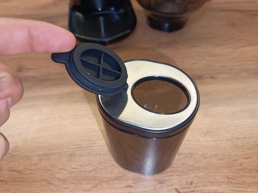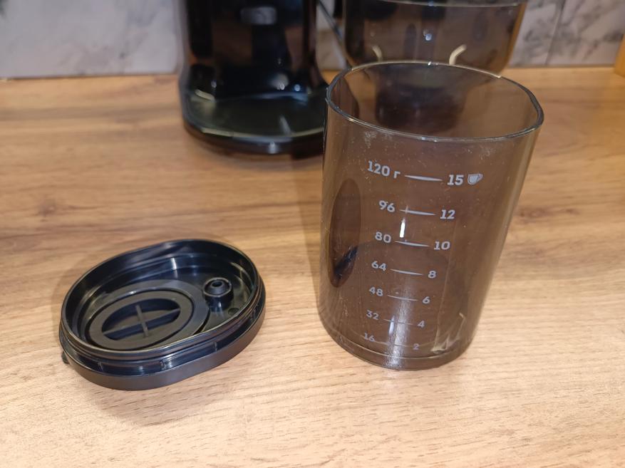 Бункер для кофе рассчитан на 120 грамм молотого кофе. Он оснащён плотной крышкой с резиновым уплотнительным кольцом, а также дополнительной резиновой вставкой в крышке. Это очевидное преимущество: герметичная крышка позволяет хранить остатки молотого кофе прямо в бункере, без необходимости пересыпать их в отдельную ёмкость.