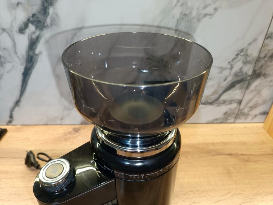 Бункер для кофе выполнен широким, что делает процесс засыпки зерен особенно удобным. На фотографии я засыпал ровно 200 грамм кофе, и при этом видно, что ещё остаётся место примерно на 100 грамм. Крышка герметичная, поэтому оставшиеся зерна можно хранить прямо в бункере, не пересыпая их в отдельную герметичную упаковку, сохраняя свежесть кофе надолго. Крышка полностью снимается, что облегчает процесс чистки и мойки бункера, например, после замены сорта кофе.
