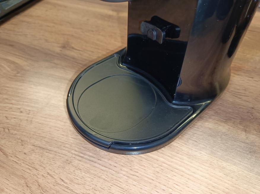 Контейнер легко устанавливается без особых усилий и без дополнительных фиксаторов. Он размещается на съёмном поддоне, который служит для сбора остатков кофе и предотвращает загрязнение рабочей поверхности. Датчиков установки контейнера для молотого кофе здесь нет, поэтому можно будет установить любую другую емкость и молоть сразу в неё.