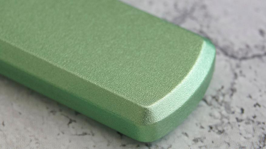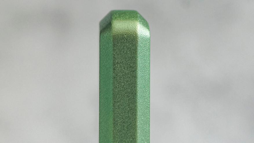 Алюминиевая поверхность имеет матовый финиш с мелким зерном, напоминающий пескоструйную обработку. Это решение не только приятно на ощупь (девайс не выскальзывает из пальцев), но и утилитарно: корпус не собирает отпечатки, а мелкие царапины на нем практически не заметны. Расцветка модели — насыщенный зеленый, который маркетологи назвали Apple Green. Цвет сочный, но не ядовитый, и красиво играет на свету благодаря фактуре металла.