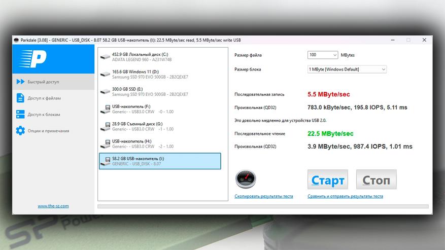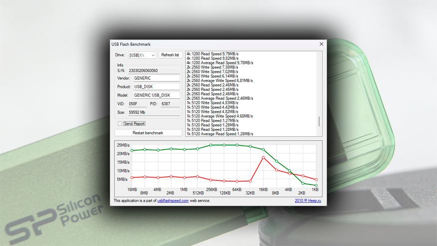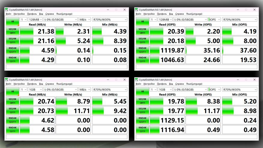 Результаты в синтетических бенчмарках демонстрируют скорости чтения и записи на уровне приблизительно 20 МБ/с и 5 МБ/с соответственно.