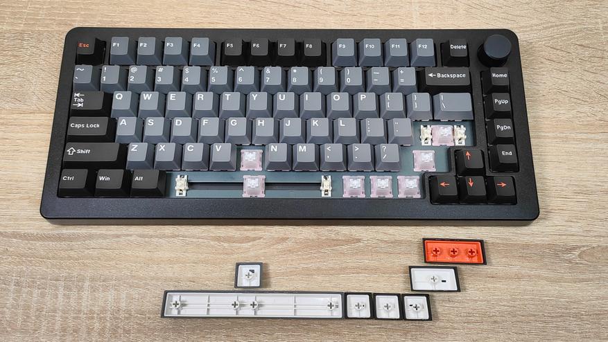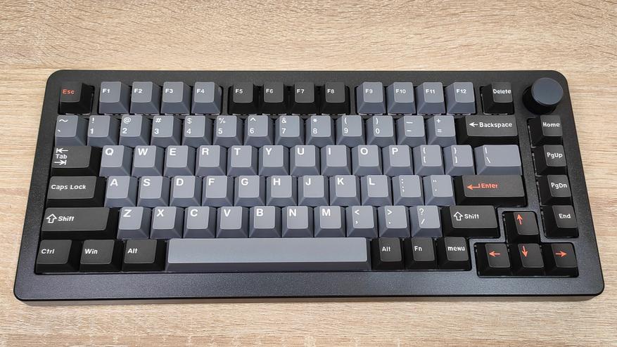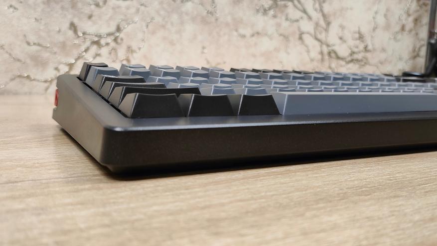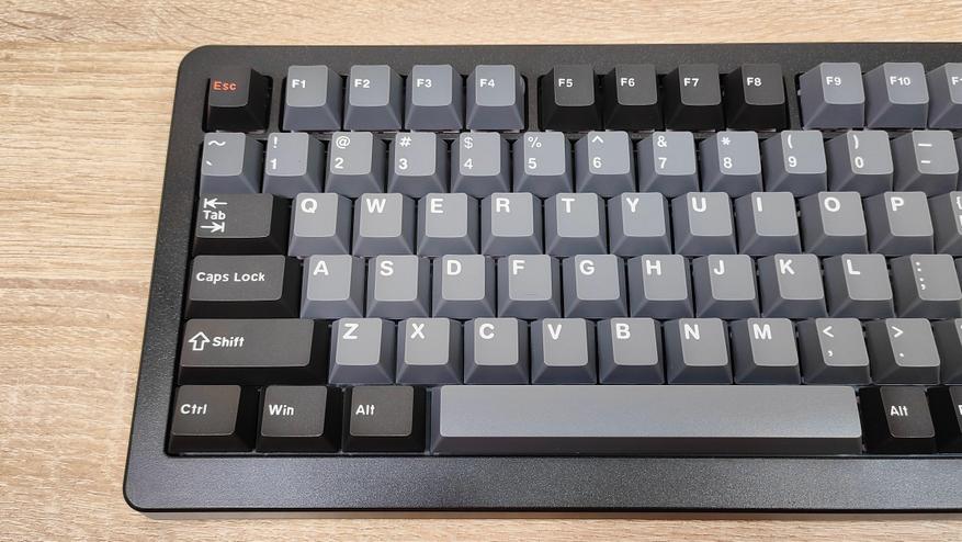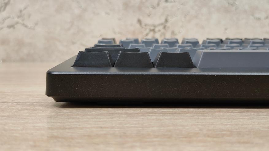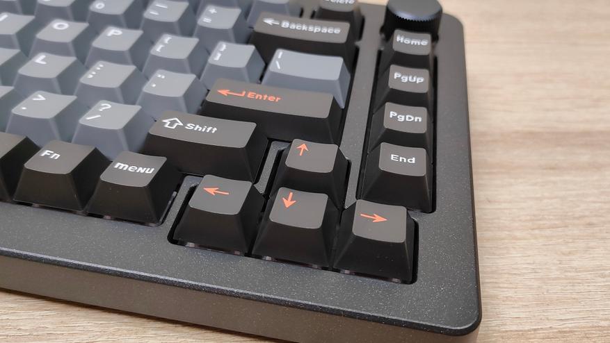 Формат клавиатуры 75% ANSI, широкие шифты, одноэтажный Enter. Профиль колпачков старый добрый OEM, который встречается на огромном количестве клавиатур, начиная от бюджетнейших мембранок, заканчивая тяжёлым люксом в механике/оптике. Все клавиши вогнутые, кроме пробела, он по-классике выпуклый.