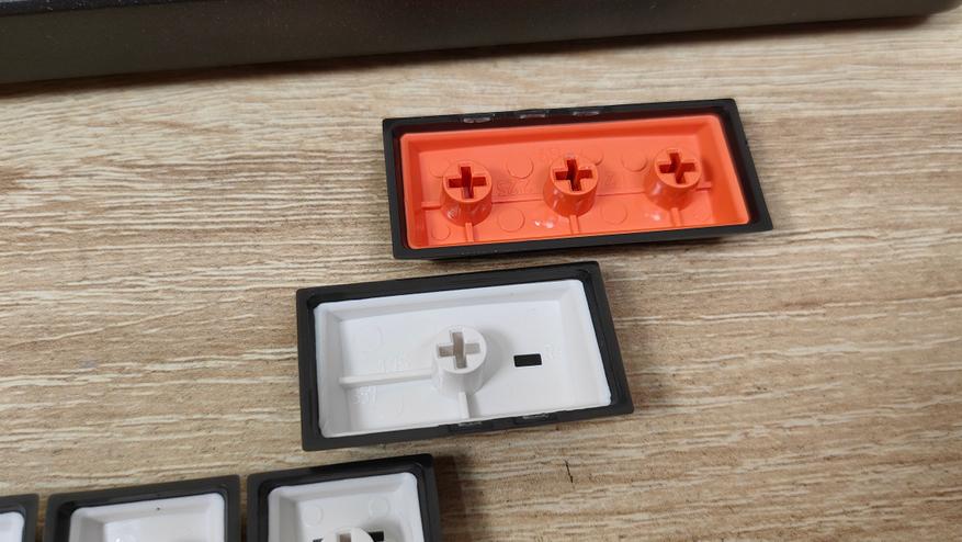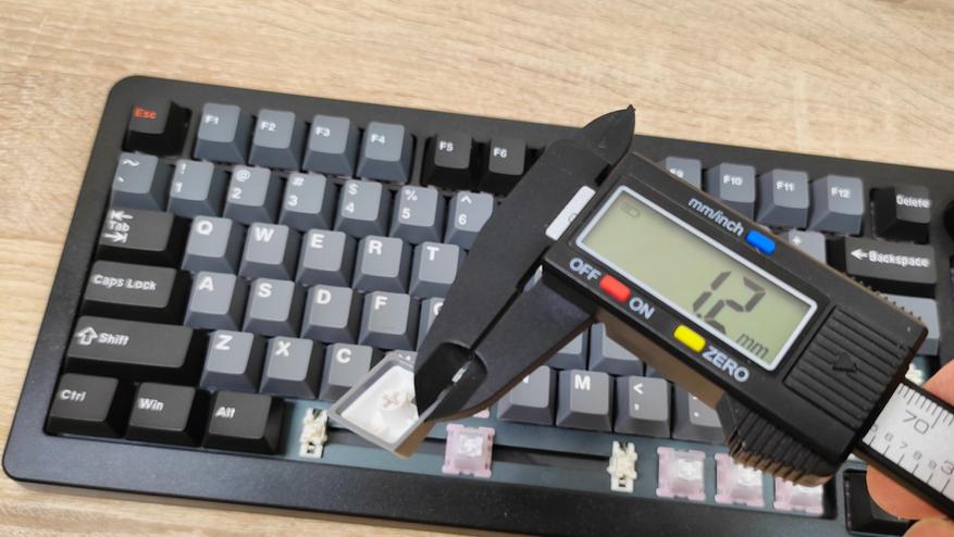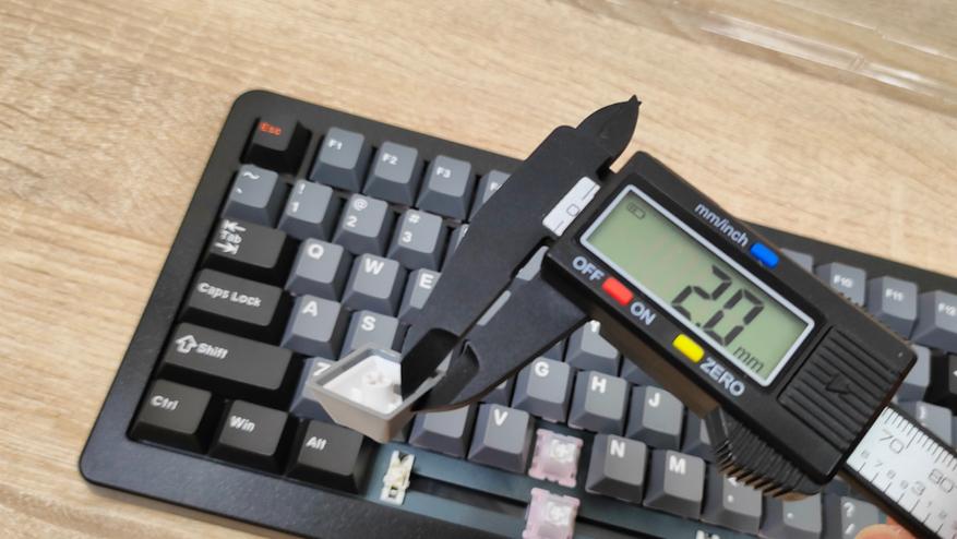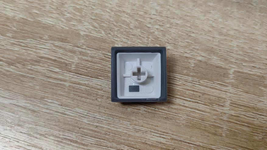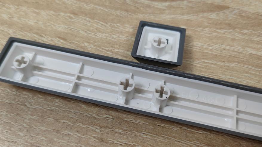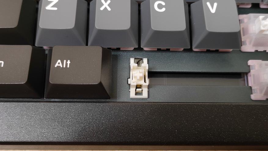 Колпачки выполнены из PBT пластика, конечно же, двойным литьём. По-старой традиции, оба слоя PBT, соответственно, ждать того, что символы будут подсвечиваться не стоит. К исполнению претензий нет, перчатки не цепляются за края, а значит, обработка на хорошем уровне. Символы крупные, контрастные, различимы неплохо даже в темноте при свете от монитора. Толщина стенки одного внешнего слоя 1.2 мм, если захватить обе стенки, выходит около 2 мм. Стабилизаторы установлены в металлическую пластину позиционирования и очень аккуратно смазаны, примерно так, как смазывают переключатели,