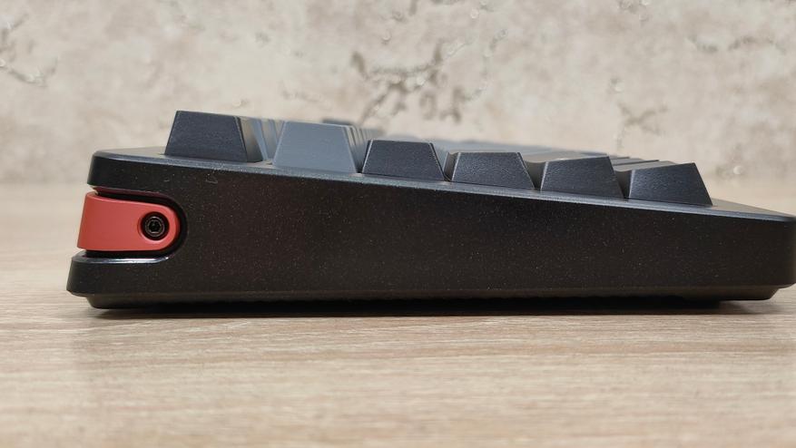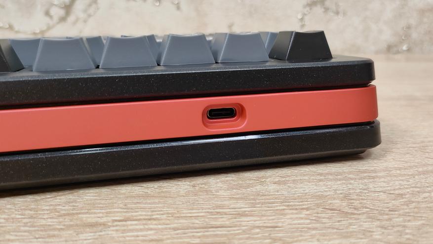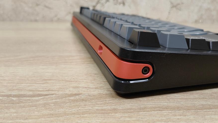 С виду вроде бы обычная клавиатура, преимущественно чёрного цвета. Однако, что-то в ней цепляет и опять же создаёт впечатление, что это не клавиатура по цене 10-ти стаканов кофе. Корпус хоть и с виду обычный пластиковый, черный, но вблизи у него видны некие вкрапления, которые слегка поблёскивают, а ещё, он тактильно неплох, слегка шершавый. Основные символы все крупные, контрастные и привычные по виду, а вот всякие Shift, Enter и меню, имеют какой-то своеобразный шрифт, который слегка выбивается из общей строгой картины, придавая некий элемент мультяшности. Хотя если вспомнить название бренда, то, наверное, удивляться нечему. Ещё привлекает внимание к себе цвет некоторых надписей, оранжевый с тяжёлым красным оттенком (как красный кирпич), очень сильно контрастирует, но этот элемент мне нравится, я люблю подобные акценты. Кроме того оранжево-красная металлическая вставка на тыловом торце также дополняет эти надписи и вместе они уже не кажутся чем-то инородным.