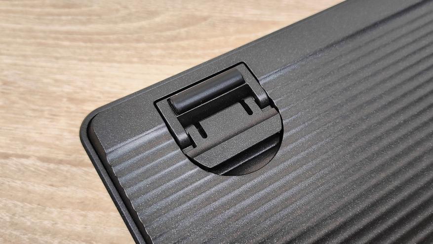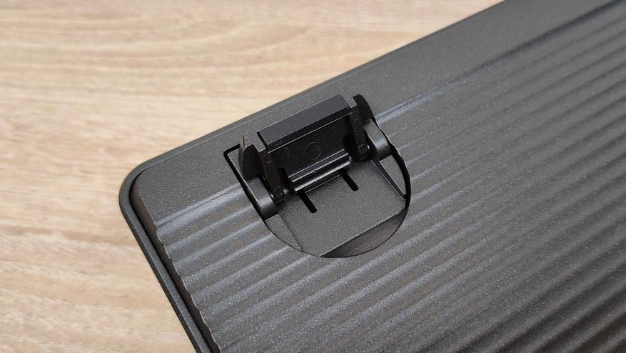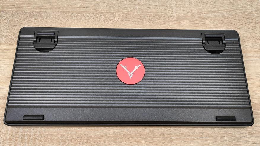 На дне, внезапно, большой круглый логотип бренда, который выполнен в виде круглой металлической таблички с оленем, но с виду не пьяным. Оранжево-красный цвет также продолжают тему акцентов в этой клавиатуре. Силиконовые упоры и выдвижные ножки здесь есть, но они здесь очень непростые, о чём я расскажу позже. Скажу только, что это очень интересная фишка, которую я встречаю впервые.