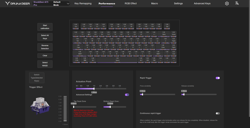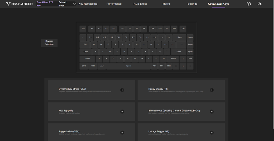 ПО в духе современного веяния, работает в браузере и настроить можно все, что и должно поддаваться настройке: макросы, переназначение клавиш, подсветка, настройка каждого переключателя и все фишки магнитных переключателей, например, Rapid Trigger
