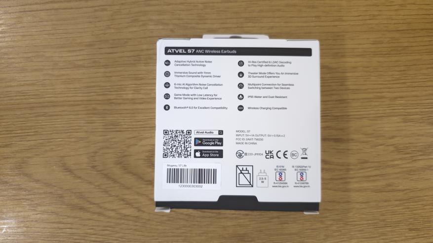 Упаковка представляет собой компактную картонную коробку. На лицевой стороне размещено изображение наушников с зарядным кейсом, указана модель S7 и ключевые обозначения: Bluetooth 6.0, LDAC и Hi-Res Audio Wireless. На обороте приведен перечень основных функций и служебная информация.