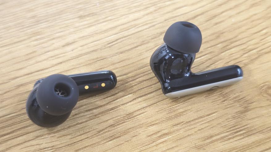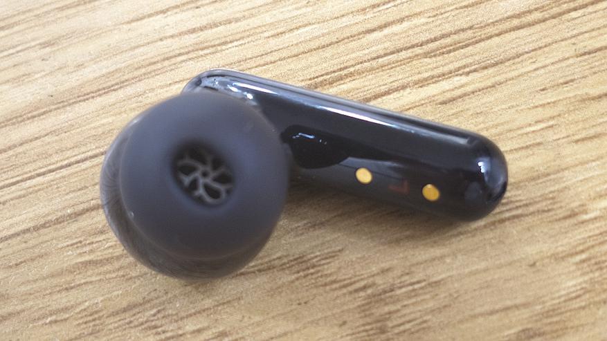 На корпусе каждого наушника размещены отверстия микрофонов. Один расположен ближе к звуководу и является внутренним, другие выведены на внешнюю часть корпуса и ножки. Это отдельные микрофоны отвечающие за восприятие голоса и за отслеживание окружающего шума. Сенсорные зоны управления находятся на внешней стороне ножек, именно через них осуществляется управление воспроизведением, звонками и режимами работы. Физических кнопок на корпусе нет, все элементы управления выполнены заподлицо.