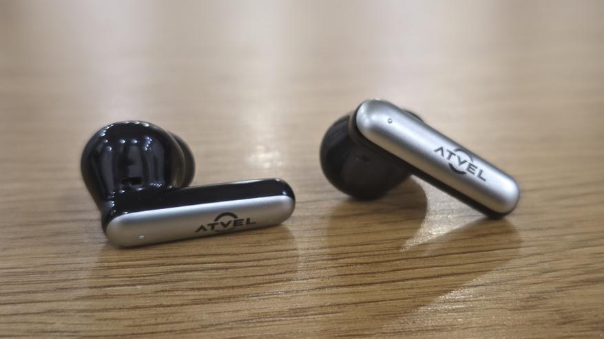 Наушники выполнены в формате внутриканальных моделей с вытянутой ножкой. Основная часть корпуса имеет глянцевую черную поверхность, а внешняя сторона ножки выделена контрастной серебристой вставкой с логотипом ATVEL. Форма корпуса округлая, без резких граней, с плавными переходами между элементами. Звуковод короткий, с силиконовой амбушюрой, которая плотно надевается и закрывает сопло. Амбушюры сменные, из мягкого силикона, визуально стандартной формы.