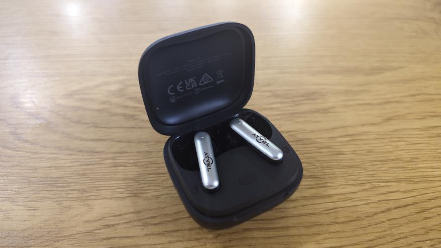 В комплект поставки входят сами беспроводные наушники, зарядный кейс, кабель USB-C для зарядки, комплект сменных силиконовых амбушюров, инструкция пользователя и гарантийный талон. Также в коробке присутствует карточка с краткой схемой сенсорного управления и QR-кодами для загрузки фирменного приложения Atvel Audio.