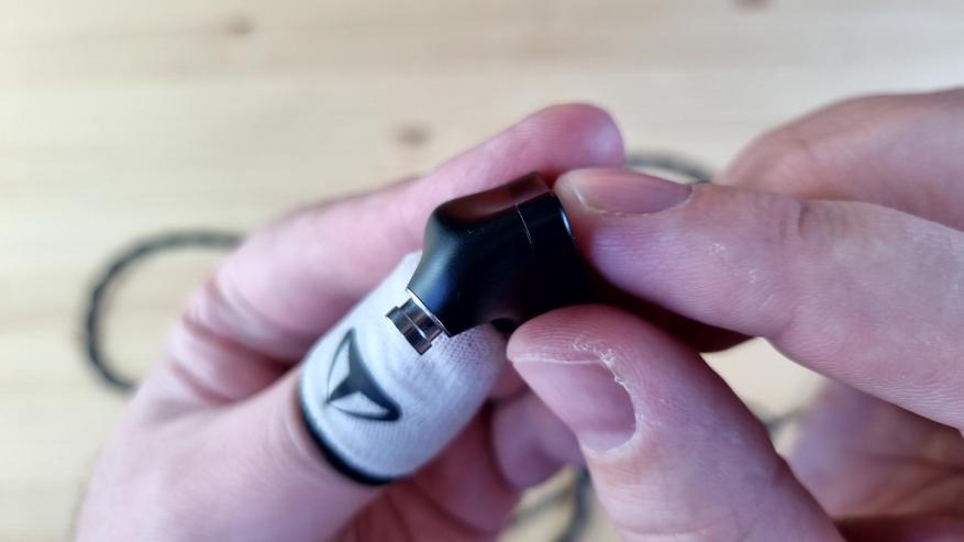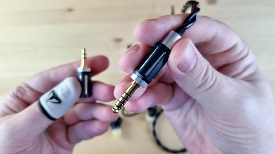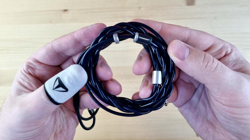 Кабель очень хорош, он плотный, гибкий, витой, с системой из сменных штекеров, металлическими элементами и сопротивлением по 0.3 Ома на левом и правом канале и 0.09 Ом на общей жиле. Напоминаю, что так делают специально. Менять такой кабель точно не нужно.
