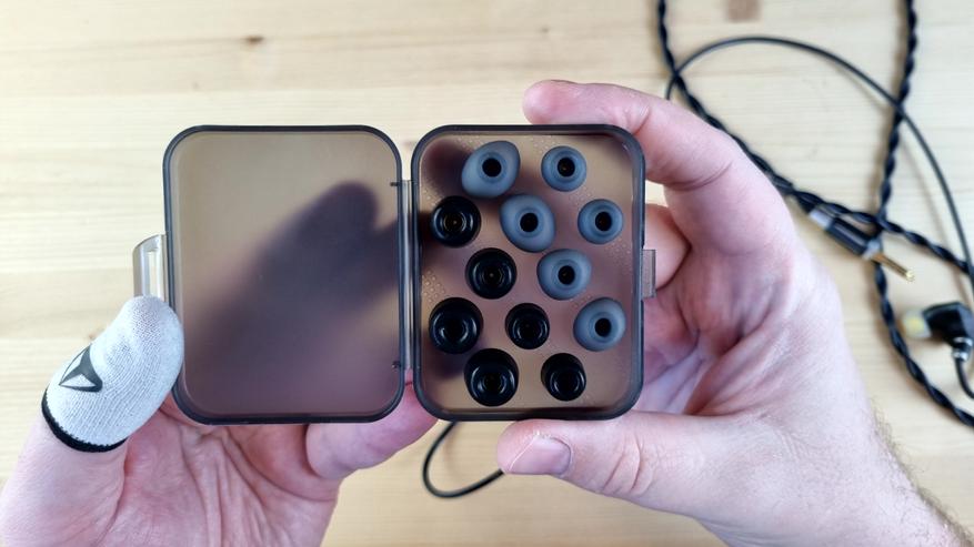 Внутри был вместительный плотный бокс, инструкция, салфетка для ухода за наушниками, запасные сеточки в звуковод, пенки и набор простых силиконовых амбушюр. Вот тут разгуляться не дали.