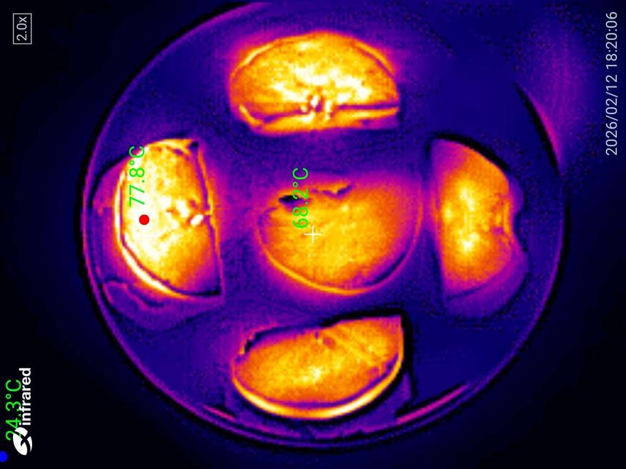 Результат оказался ожидаемым: температура долек яблока поднялась почти до 80 °C, при этом нагрев был практически равномерным. Существенных температурных различий между разными участками не наблюдалось.