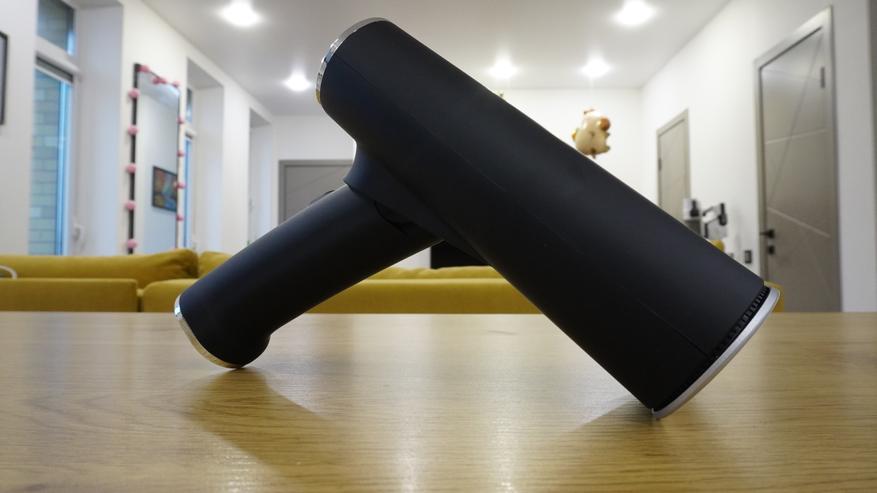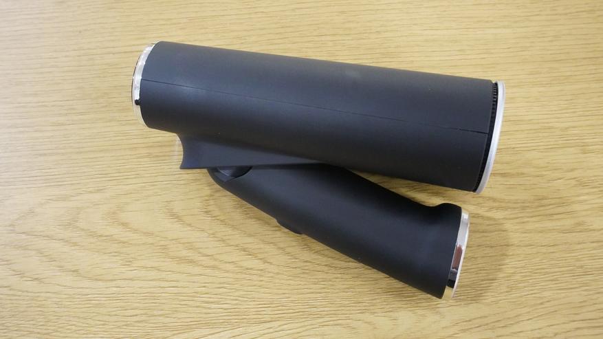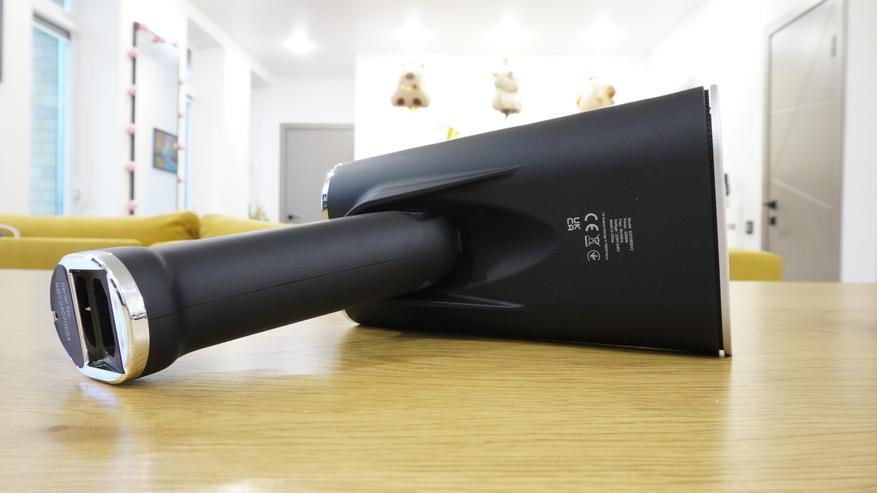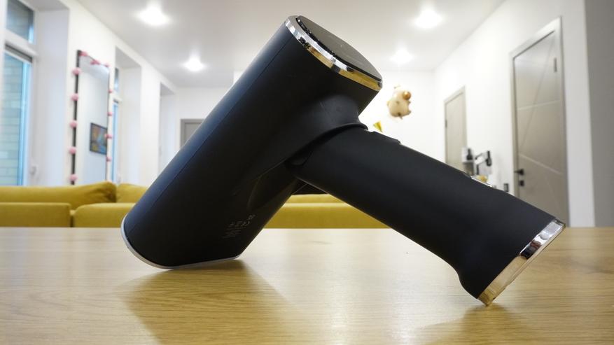 Корпус отпаривателя выполнен в черном цвете из пластика с Soft Touch поверхностью. На ощупь материал плотный и слегка бархатистый, за счет чего устройство не скользит в руке. Конструкция складывающаяся: рукоять складывается, и в сложенном виде отпариватель становится заметно короче, что удобно при хранении или перевозке. Линии корпуса плавные, без острых переходов, все детали подогнаны аккуратно, зазоры минимальны. На торцах видны хромированные обводки — они визуально добавляют симметрии и подчеркивают форму устройства.