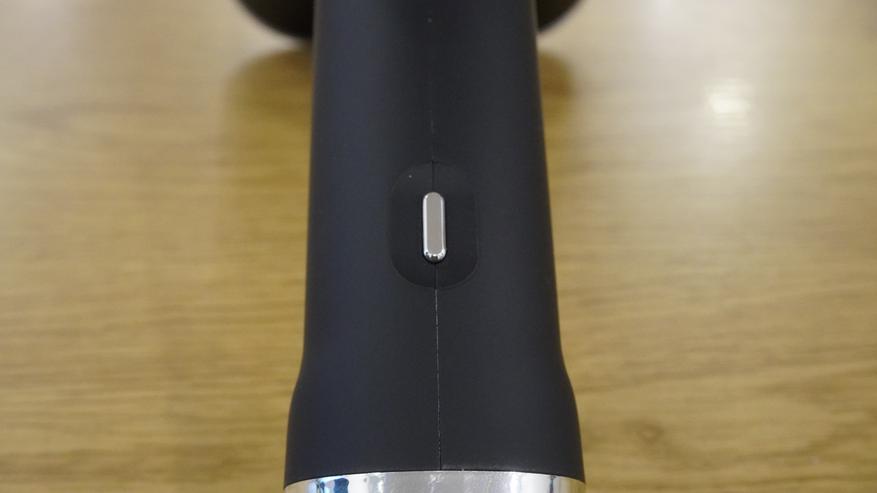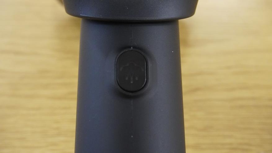 Ручка выполнена под небольшим углом, удобно ложится в ладонь. На ней размещена основная кнопка с пиктограммой пара. Кнопка имеет мягкий ход. Она оснащена подсветкой, которая загорается при включении устройства. Ниже находится кнопка включения-выключения устройства, она не имеет никакой индикации.