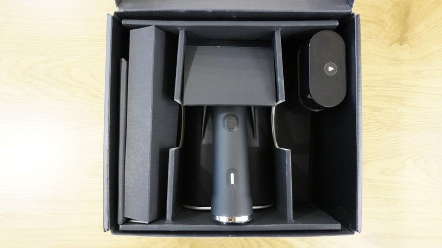 В комплект поставки входят сам отпариватель с установленным малым резервуаром для воды, увеличенный резервуар, изолирующая подставка, сетевой шнур, транспортировочный мешочек и краткое руководство пользователя. Все уложено аккуратно, с отдельными секциями под каждую деталь, что облегчает хранение и транспортировку.