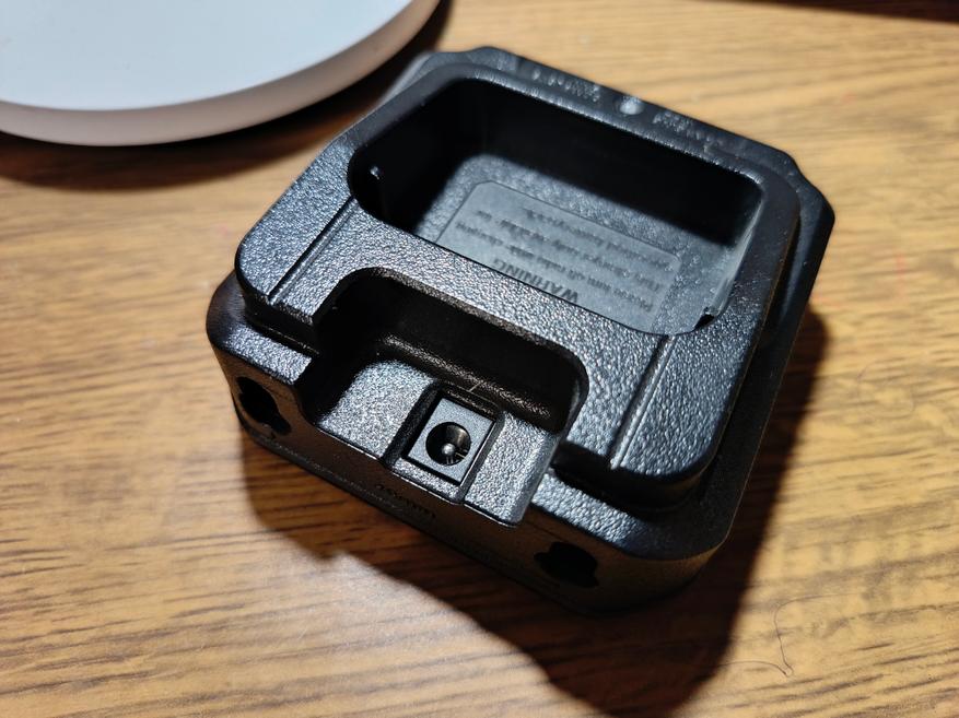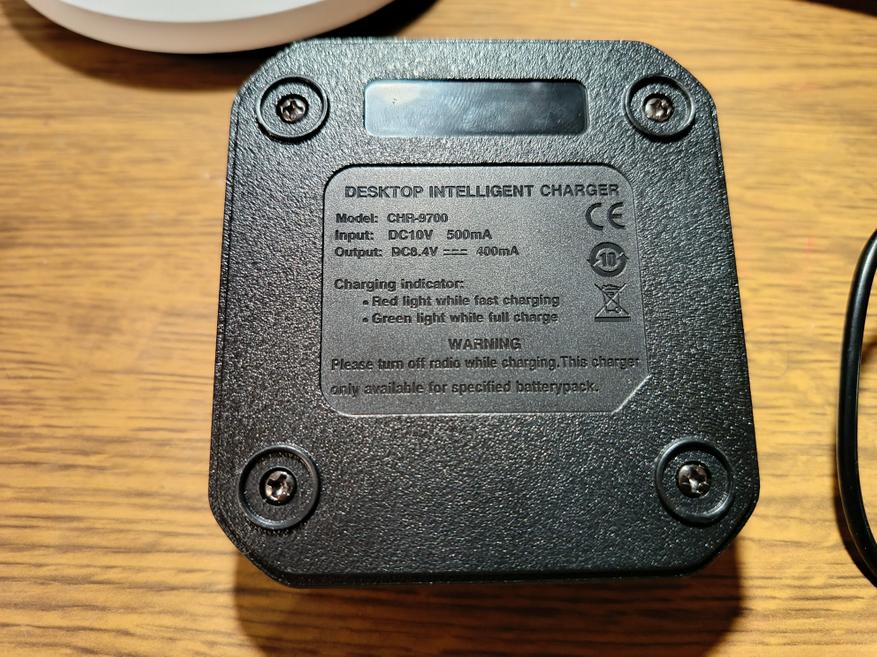 Перед нами относительно стандартный зарядный стакан от рации, к которому подключается внешний блок питания с выходным напряжением 10 вольт и силой тока 0,5 А, что в сумме даёт мощность около 5 ватт (в вашем случае может отличаться). Подключение осуществляется через классический круглый разъём формата DC 5.5 мм — достаточно распространённое и простое решение.