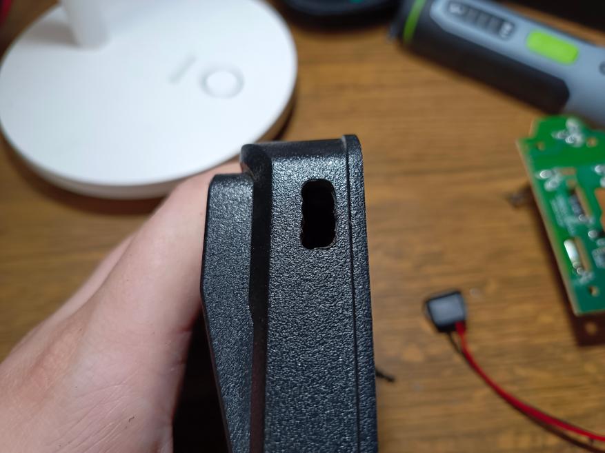 Для начала делаем гравёром отверстие под форму заранее купленного разъёма Type-C. Важно сразу примерить его к корпусу и аккуратно разметить контур, чтобы посадочное место получилось максимально точным. Конечно, при желании можно обойтись паяльником или обычным сверлом, постепенно выбирая пластик, но с гравёром работа идёт быстрее, проще и получается значительно аккуратнее.