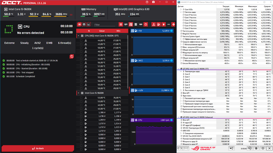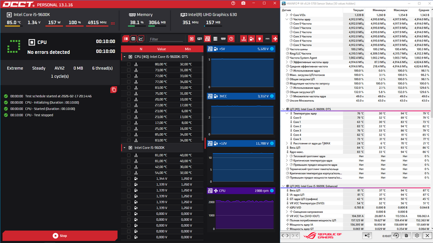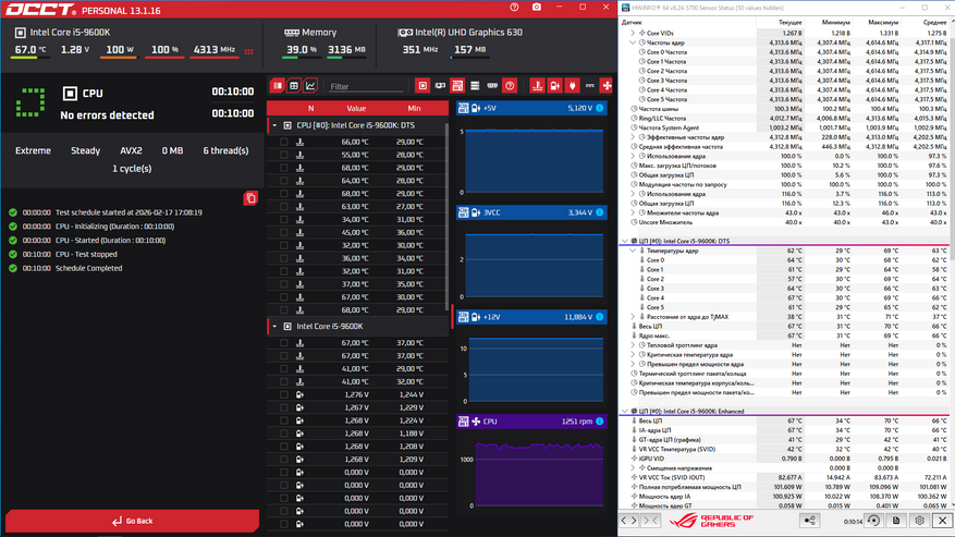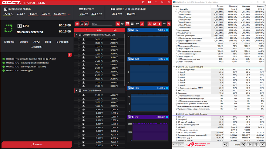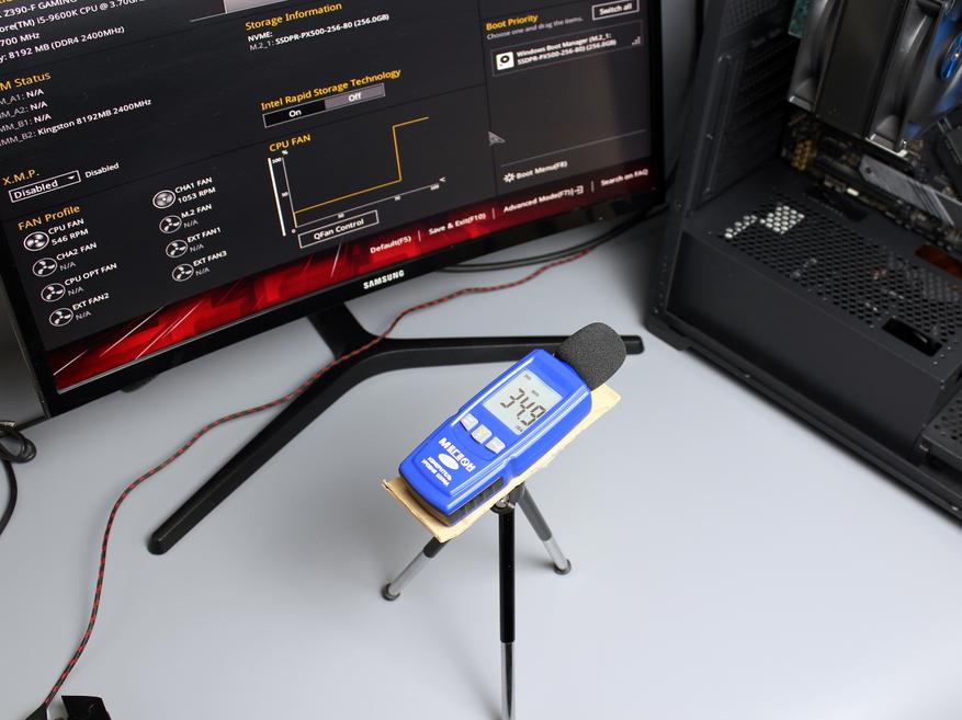В тестовом стенде использовался процессор Intel Core I5-9600K, нагрузка которого проводилась с помощью программы OCCT. Для тестирования были задействованы несколько режимов работы камня и оборотов ветродуев. Первый был при автоматическом RPM вертушек, а процессор — в стоке. Последующие же выполнялись с его разгоном до 4800 МГц, 4900 МГц и 5000 МГц. При этом вентиляторы были уже зафиксированы на максимальных оборотах.