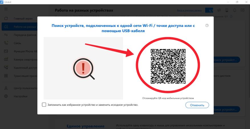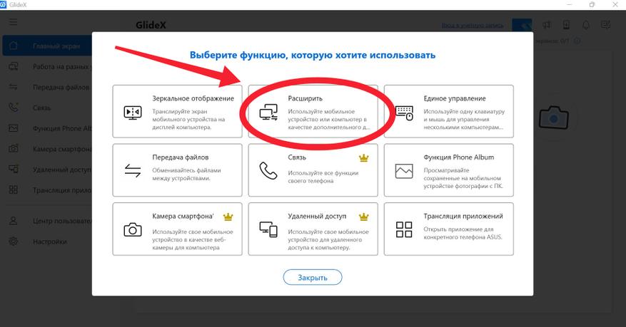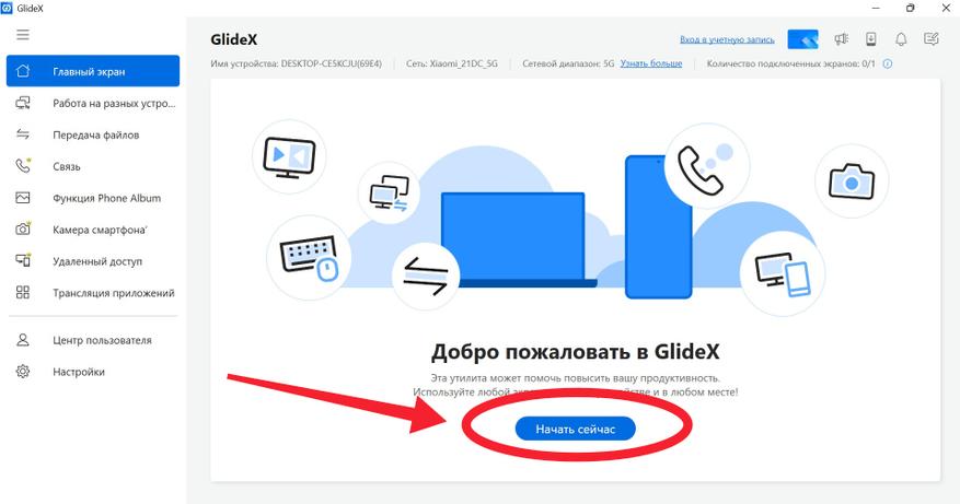 Далее возвращаемся к нашему компьютеру и в главном меню программы GlideX нажимаем кнопку «Начать сейчас», а затем кликаем на раздел «Расширить». После чего открывается QR-код, который нужно отсканировать со смартфона или планшета.