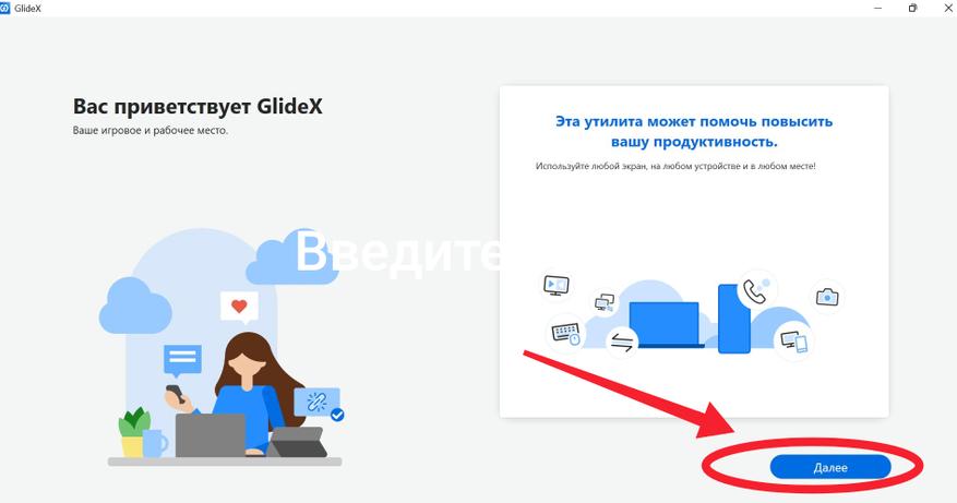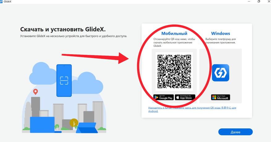 После того как всё установлено, открываем программу и проходим небольшое ознакомление, нажимая кнопку «Далее». Также следует отметить, что приложение доступно лицам старше 16 лет, для подтверждения возраста нужно поставить соответствующую галочку. После чего нам показывается QR-код, который нужно отсканировать со своего смартфона или планшета, который мы планируем использовать в качестве второго экрана. После сканирования кода нас перебрасывает в Google Play или App Store, в котором также скачиваем приложение GlideX.