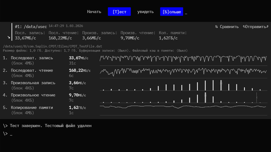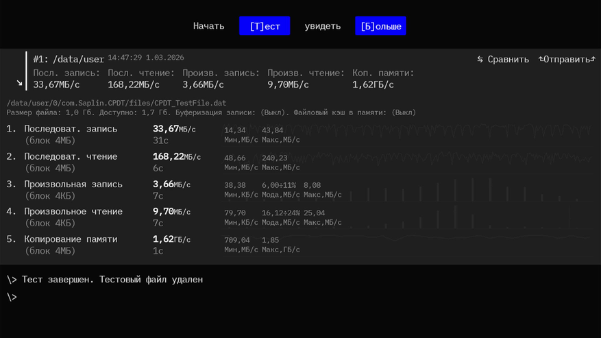 - Последовательное чтение (168.22 МБ/с): Высокий показатель для eMMC, благодаря которому система и приложения загружаются достаточно быстро.