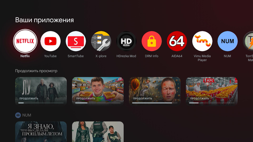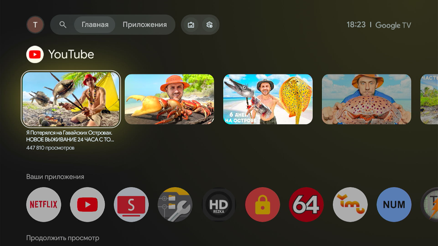 В системе используется стандартный лаунчер Google TV, интерфейс которого включает верхнее меню навигации, ленту рекомендаций и настраиваемую строку приложений. В целом оболочка работает шустро, хотя заметно, что для оптимизации оперативной памяти система агрессивно выгружает фоновые процессы. Из-за этого при запуске приложений интерфейс иногда «призадумывается» на долю секунды, что визуально обыграно анимацией иконок.