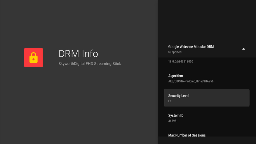 В DRM Info также можно увидеть наличие у устройства уровня защиты L1, что дает возможность просматривать контент на платных стриминговых платформах в максимально доступном для данной модели разрешении Full HD. Это важный параметр для сертифицированного устройства, так как без него легальные сервисы вроде Netflix или Кинопоиска ограничивали бы качество до уровня SD.