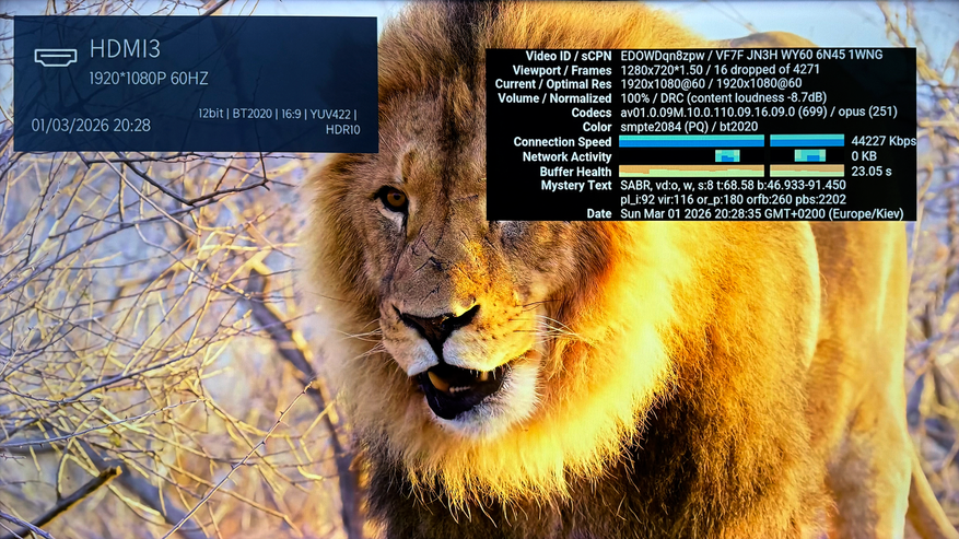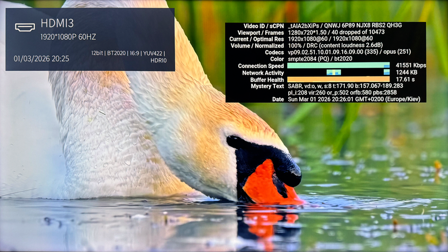 При работе с YouTube в разрешении 1080p наблюдаются незначительные пропуски кадров в первые секунды после запуска ролика или при переключении качества. Однако после стабилизации потока воспроизведение идет ровно, без дальнейших потерь. Режимы HDR обрабатываются корректно.