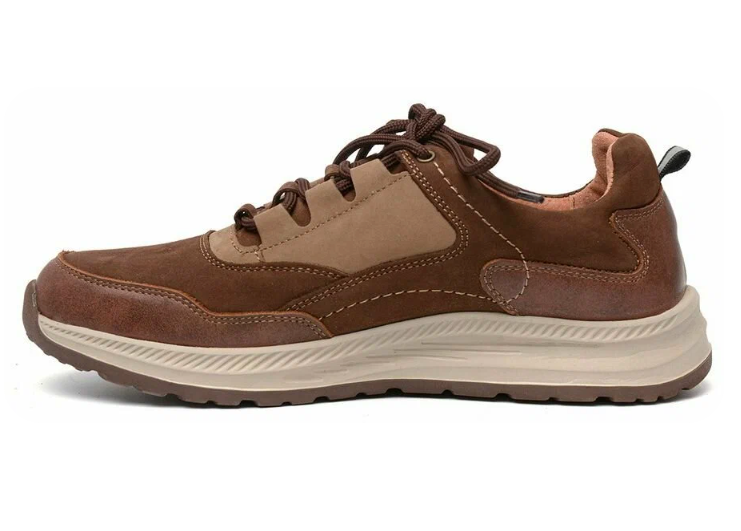 Резиновая подошва с умеренным подъёмом (около 1,3 см и каблук 2,3 см) даёт стабильность и нормальное сцепление с городским покрытием. Шнуровка фиксирует стопу без излишнего давления. Это повседневная пара в стиле sport-casual — без лишней массивности, но с понятной практичностью.