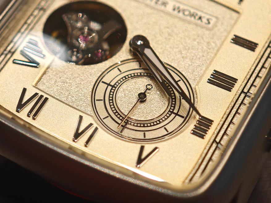 Примечательно, что это, в совокупности с прочими «хитростями», не делает, при довольно умеренном размере (38 на 46 мм), данные часы как бы тесными. А уместилось тут, правда, не так уж мало! Помимо центральных стрелок, тут и открытый баланс, и малая секунда. Циферблат тут не простой: можно насчитать несколько уровней по высоте. Плюс все это еще и окружает винтажная минутная шкала в дополнение к винтажной секундной стрелке, и она вроде как тоже должна бы скрадывать пространство…