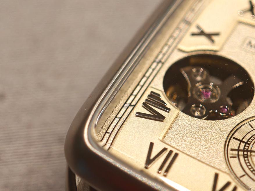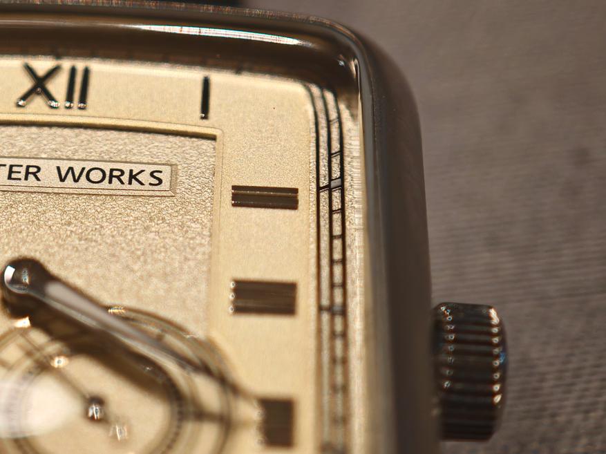 По сути, часы здесь — вообще являются капсулой, вставленной в своеобразную раму из матовой стали. Тем не менее, несмотря на это нагромождение деталей, часы не назвать ни тяжелыми, ни громоздкими. Удачная прямоугольная форма с плавными линиями работает и на визуальный эффект, и на реальный опыт ношения: