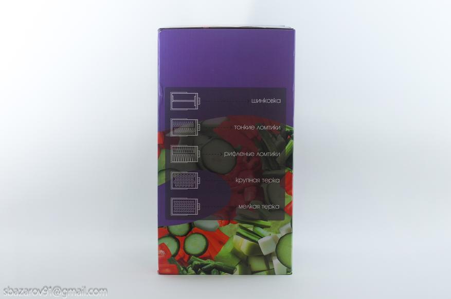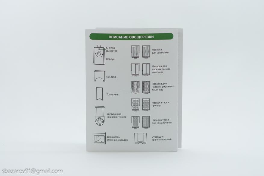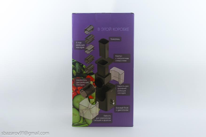 Внутри сама автоматическая овощерезка с пятью сменными насадками, пластиковым толкателем и руководством по эксплуатации. Однако полный перечень элементов гораздо больше: