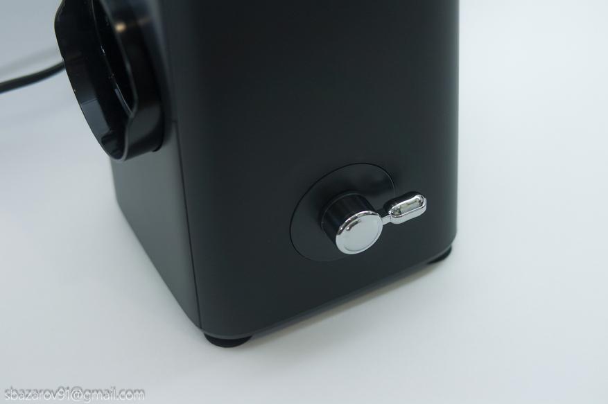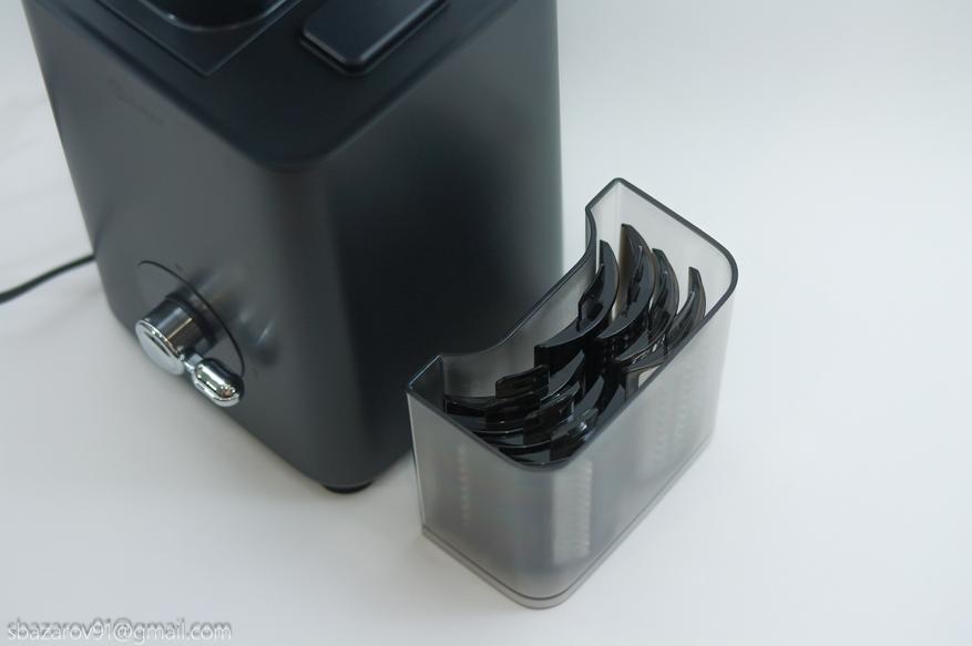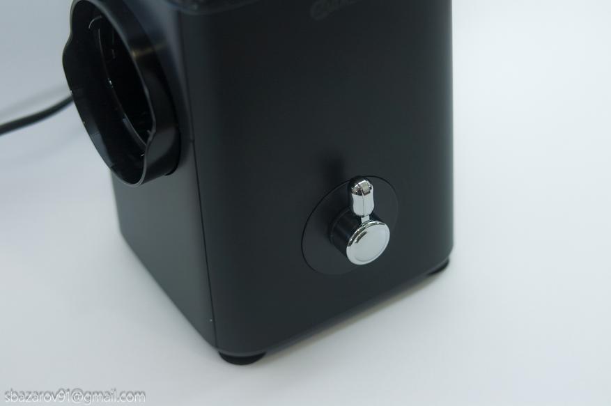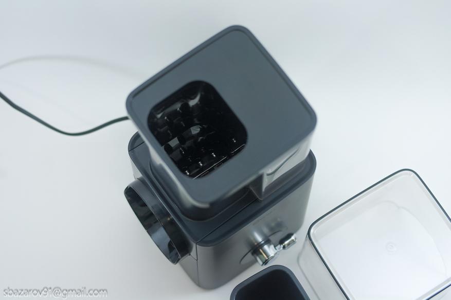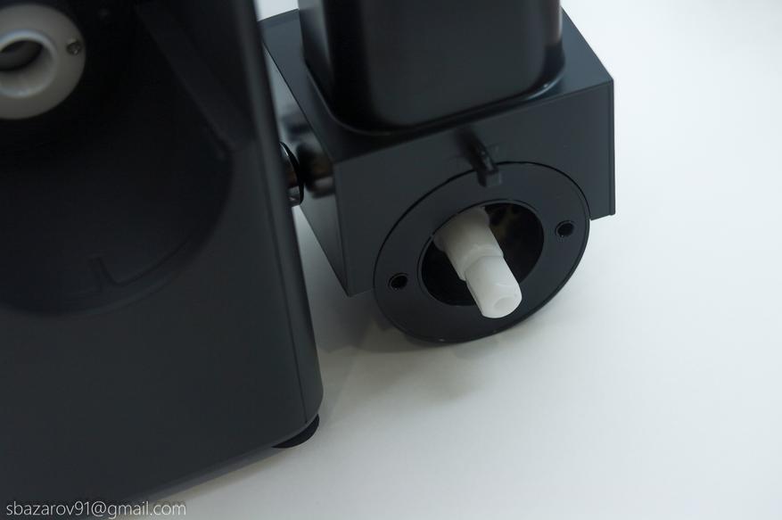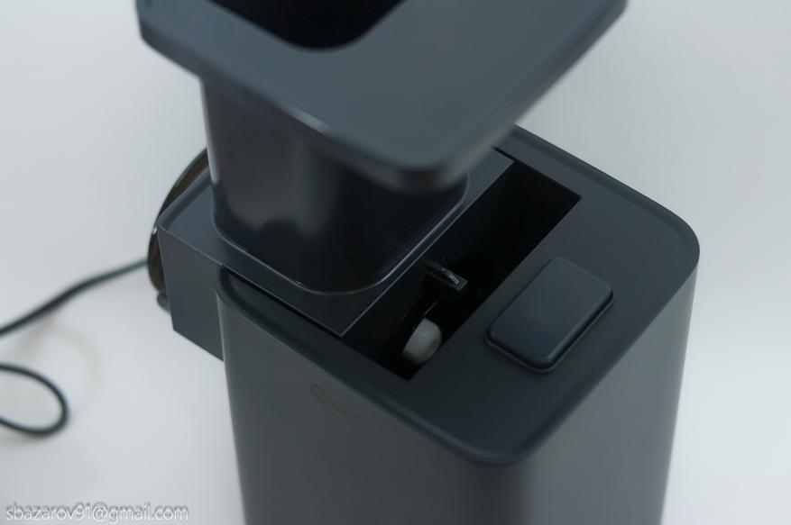 Под контейнером с насадками находится кнопка блокировки вала. После нажатия можно снять загрузочную чашу и тщательно промыть её от остатков пищи. Все соединения пластиковые, этого более чем достаточно для измельчения, так как всё происходит на малой скорости.