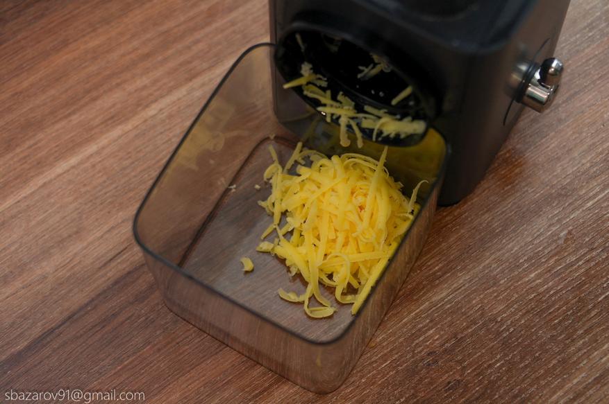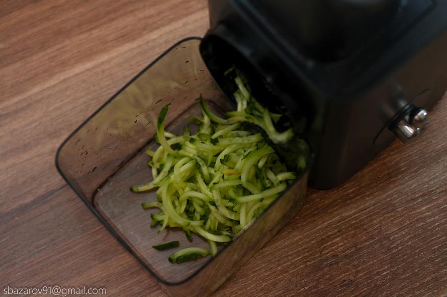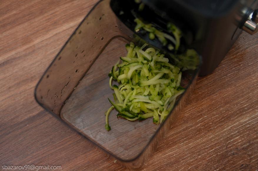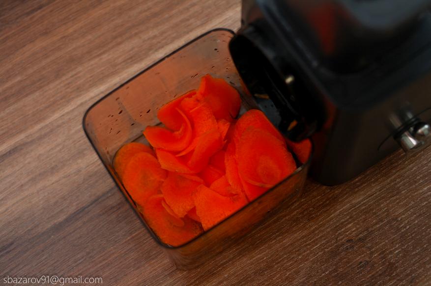 Крупная терка лучше всего подходит для тестирования на твердых продуктах: сыр, морковь, свекла или яблоки. По сути, эта насадка заменяет самую ходовую сторону на ручной терке. При её использовании хочу отметить высокую скорость работы и то, насколько ровной получается стружка. И тут нет проблем даже с мягкими продуктами (тот же огурец). А если тереть сыр для пиццы или морковь для зажарки, то можно увидеть, что насадка не размалывает продукт в крошку, а дает аккуратную соломку.