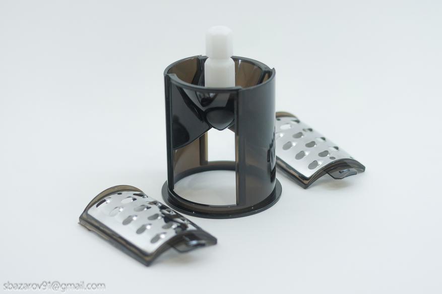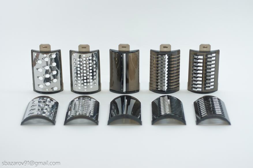Всего в комплекте имеется 5 пар насадок, выполненных из нержавеющей стали. Сами насадки схожи с теми, что встречаются в ручной терке, и даже немного расширяют её возможности.