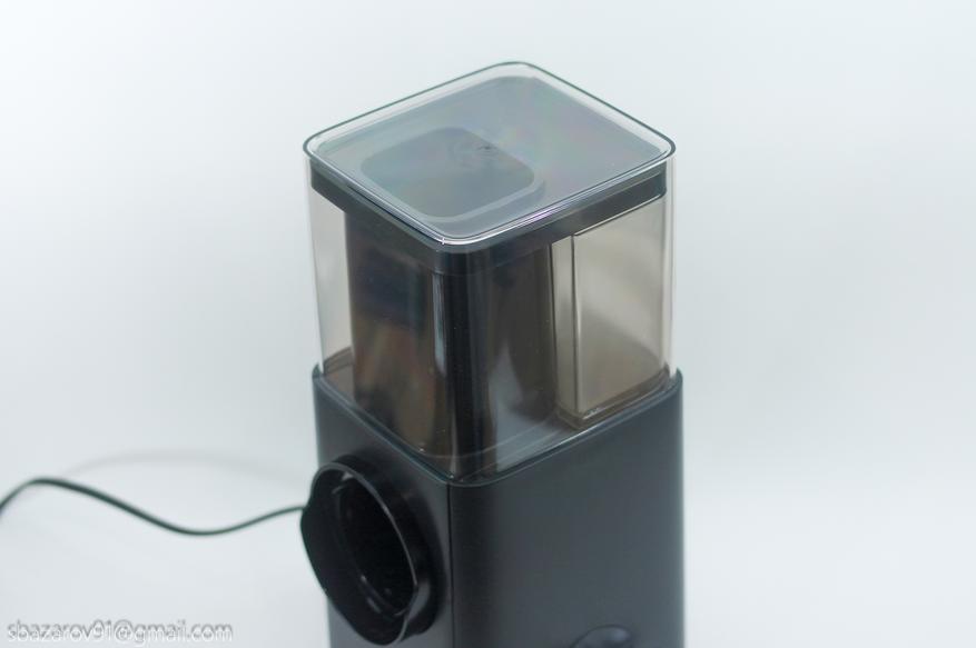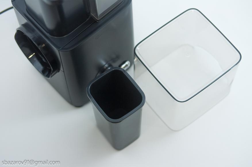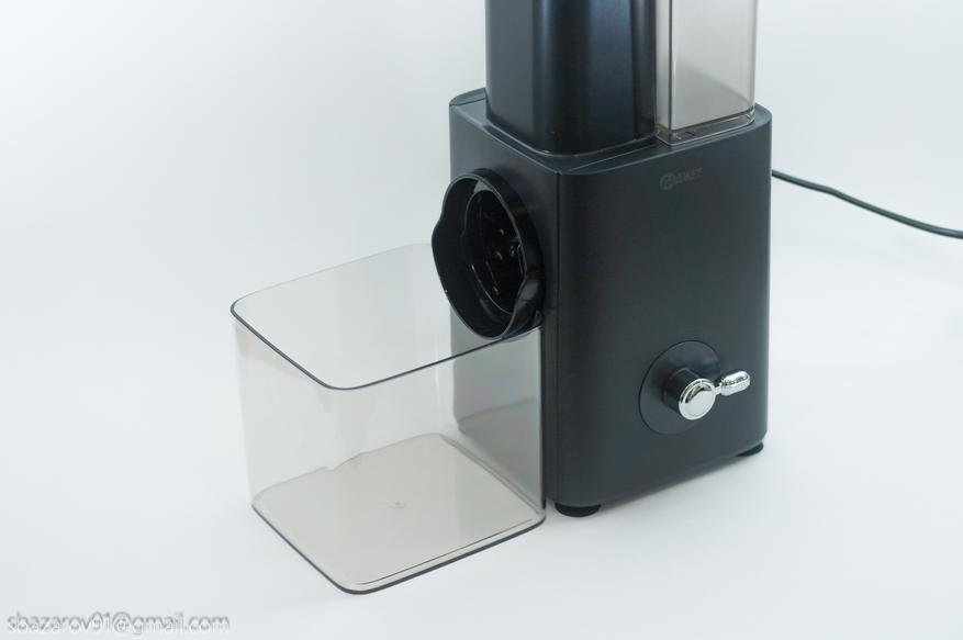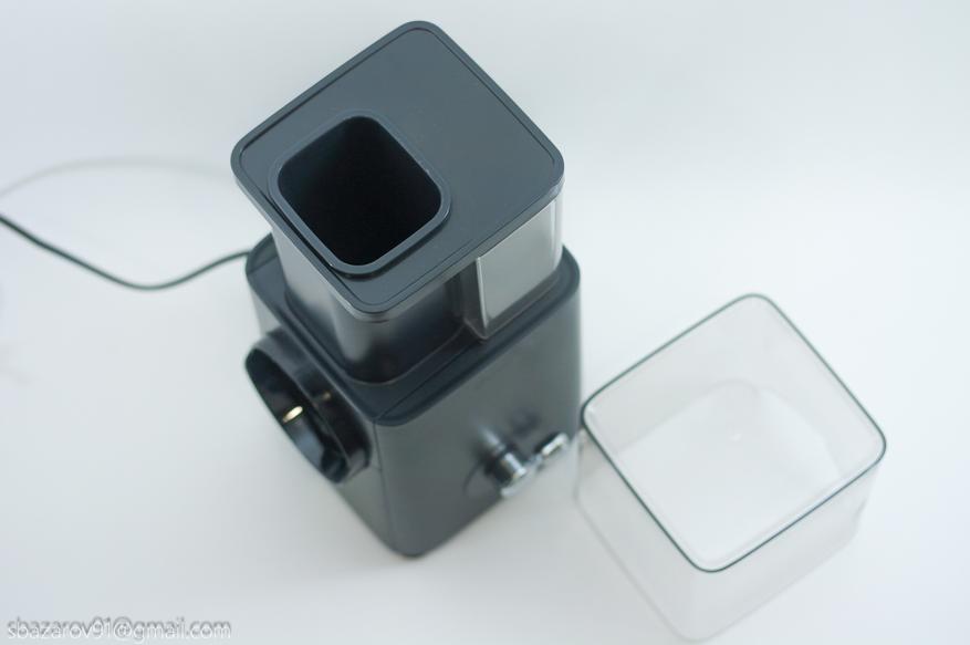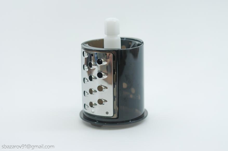 Все продукты подаются через горловину в верхней части корпуса, прикрытую специальной крышкой. Ширина загрузочного отверстия — 70 мм, идеальный размер для яблок, сыра и других продуктов. После попадания на сменные насадки измельченная масса выходит через специальное отверстие в передней части и попадает в ёмкость для нарезанных продуктов (она же является верхней крышкой,